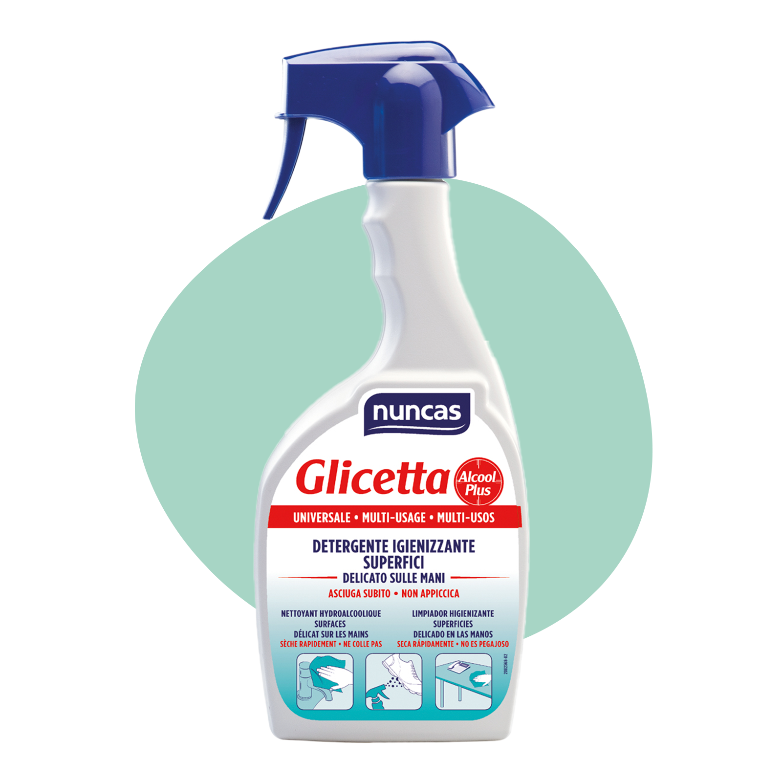 Glicetta Alcool Plus Igienizzante per la casa è un prodotto multiuso quotidiano ideale per l'igiene di tutte le superfici lavabili della casa come piani cottura, wc, rubinetti, piastrelle, maniglie, giocattoli dei bambini, palloni e qualsiasi oggetto che possa essere stato precedentemente sporco o contaminato. È perfetto anche per pulire tutto ciò che è più esposto a germi e batteri, come i bidoni della spazzatura. Asciuga rapidamente, non lascia aloni e non lascia residui appiccicosi. È perfetto anche da usare direttamente sulle mani: grazie alla presenza della glicerina, non secca la pelle e la mantiene morbida anche dopo diverse applicazioni. È ideale dopo aver pulito le verdure, il pollo o aver maneggiato le uova.