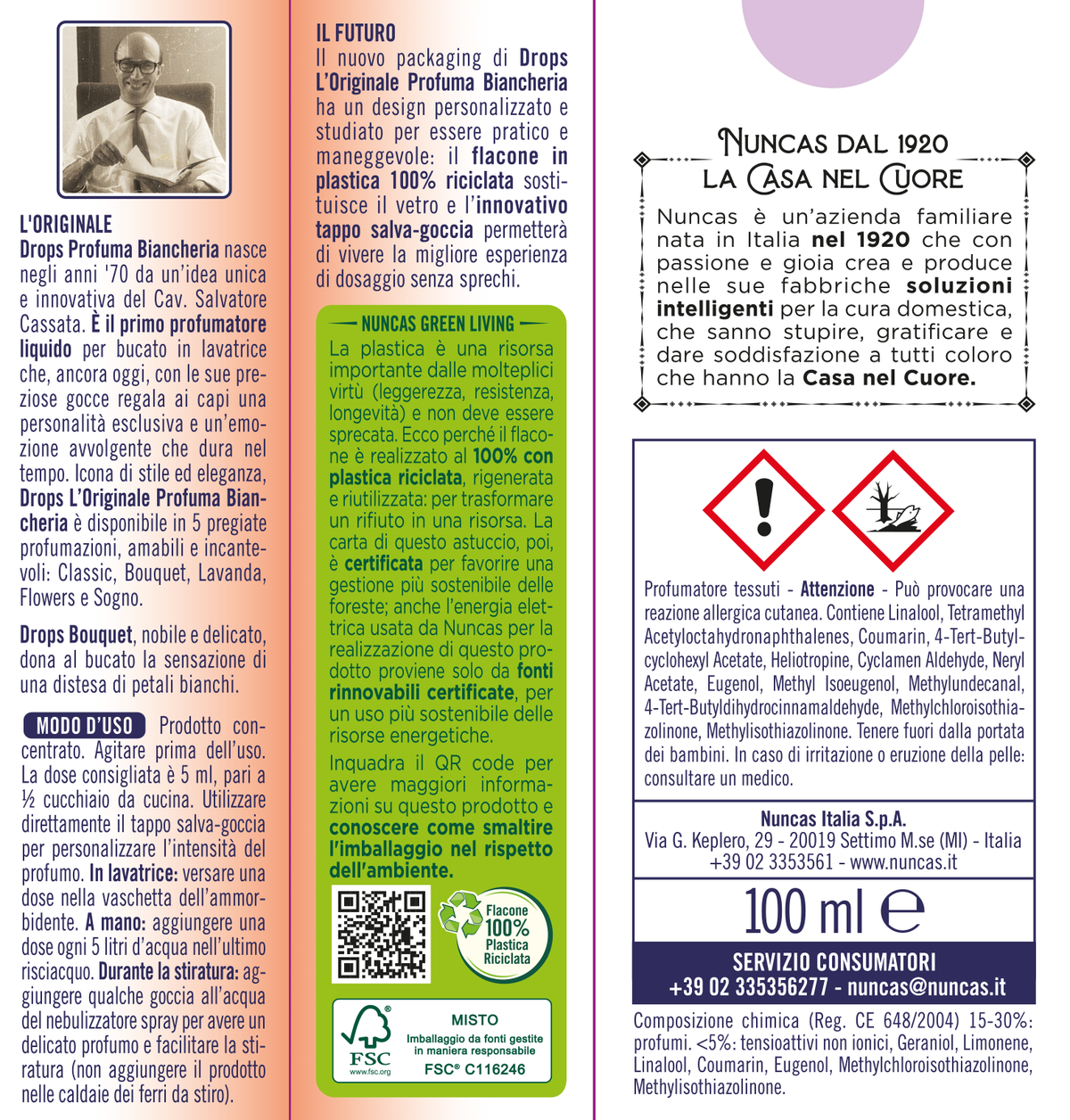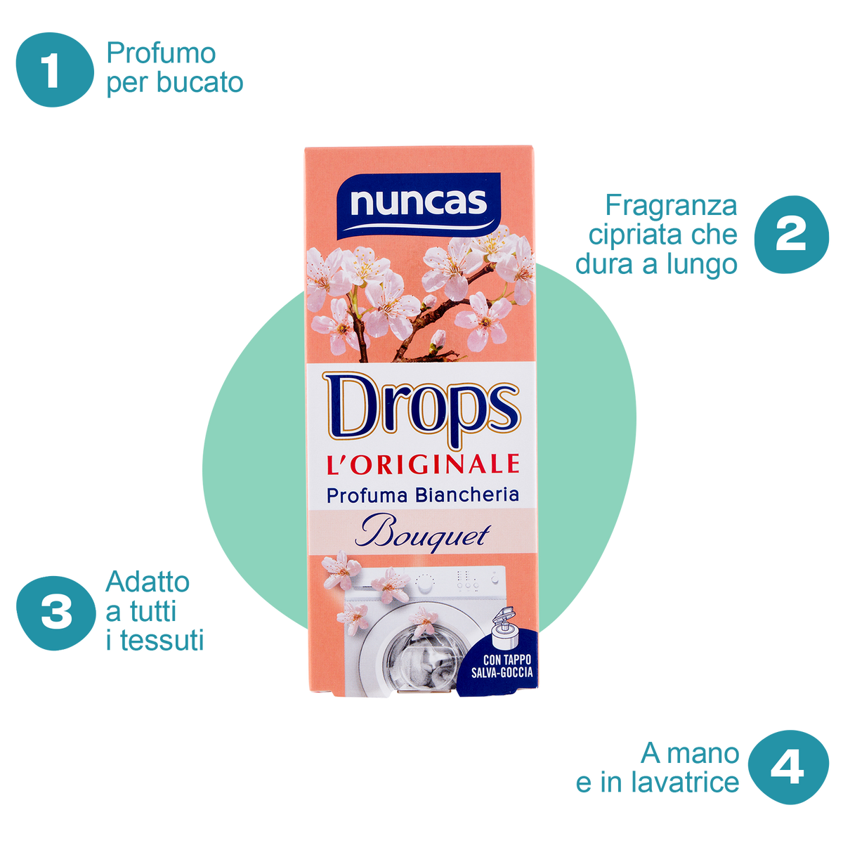 Bastano poche gocce di profumo Drops l'Originale Bouquet all'ultimo risciacquo per donare a tutto il bucato un profumo sottile e raffinato che permane a lungo sui tessuti donando una piacevole sensazione di benessere. Queste fragranze Nuncas sono particolarmente durevoli e persistono sul bucato.