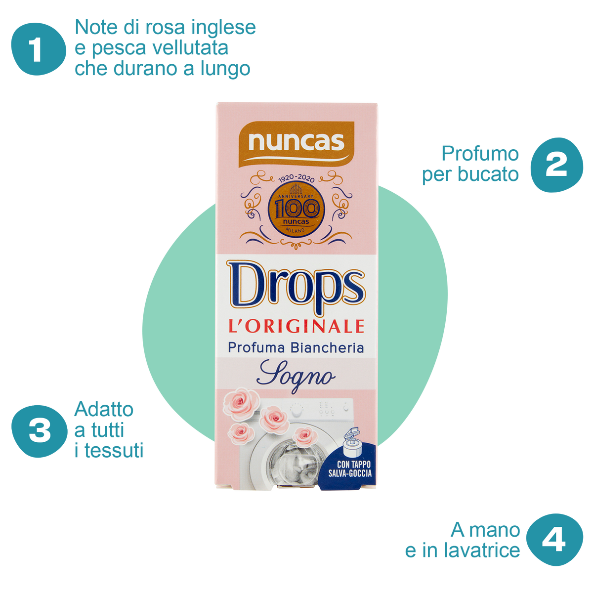 Bastano poche gocce di profumo Drops l'Originale Sogno - Limited Edition - all'ultimo risciacquo per donare a tutto il bucato un profumo sottile e raffinato che permane a lungo sui tessuti donando una piacevole sensazione di benessere. Queste fragranze Nuncas sono particolarmente durevoli e persistono sul bucato.