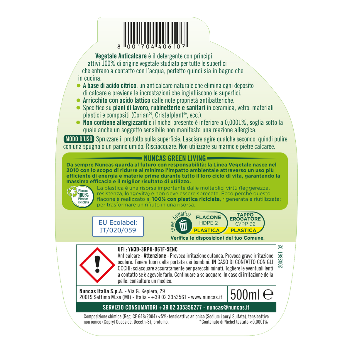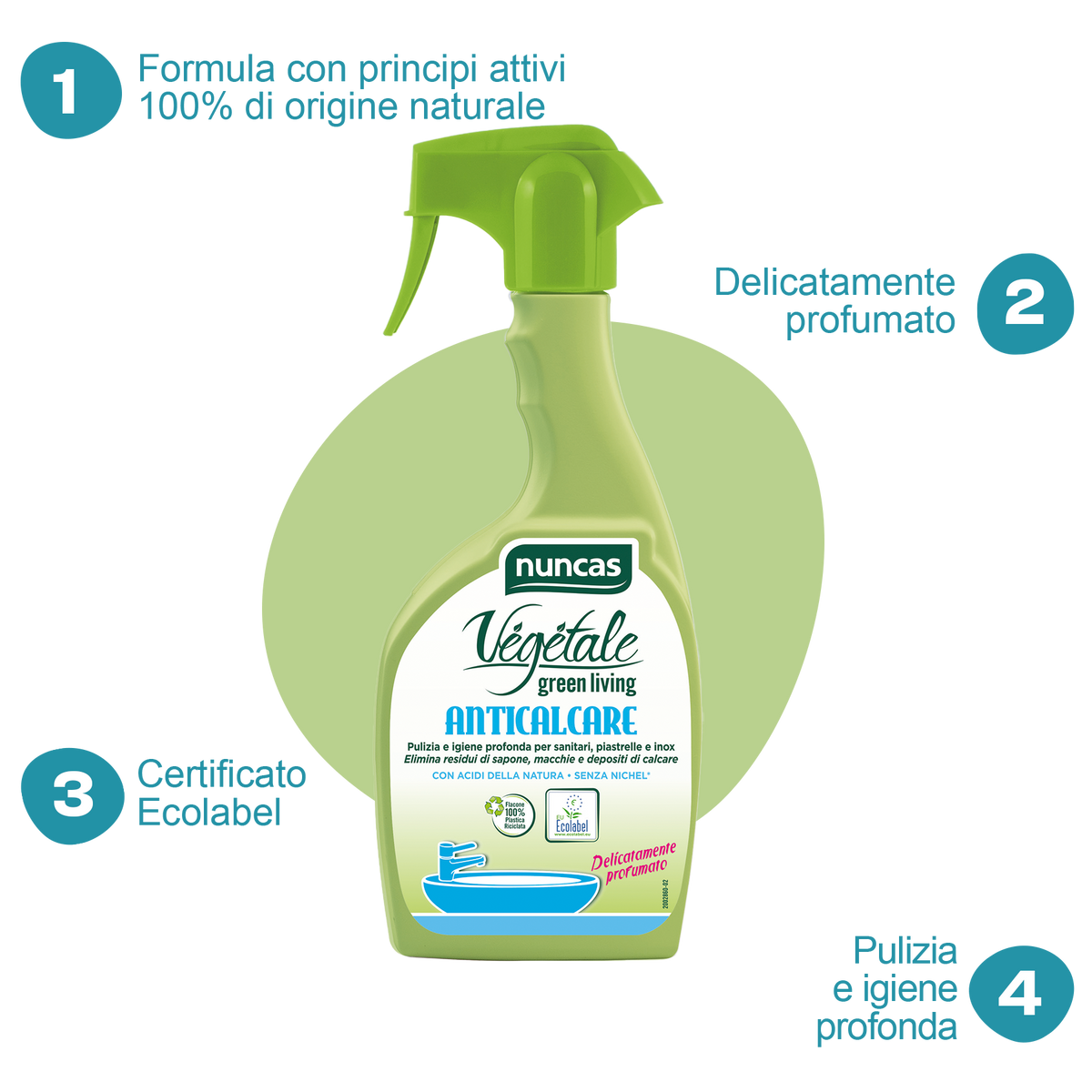 Vegetale Detergente Anticalcare è il nuovo detergente delicato di Nuncas studiato per rimuovere il calcare e i depositi di ruggine dai sanitari, rubinetteria e piani di lavoro in ceramica, vetro, materiali plastici e compositi. Perfetto per chi come noi rispetta la salute e l'ambiente.