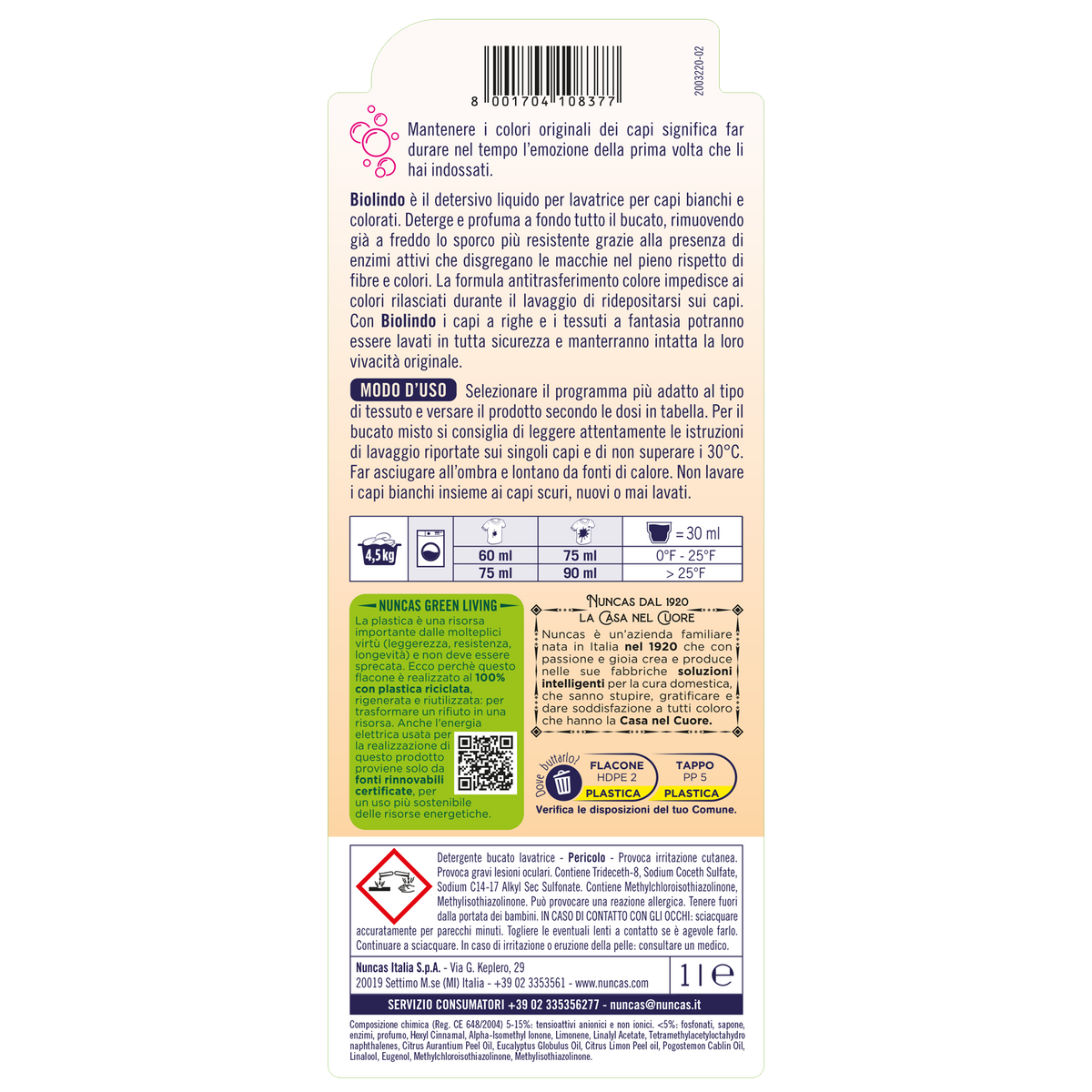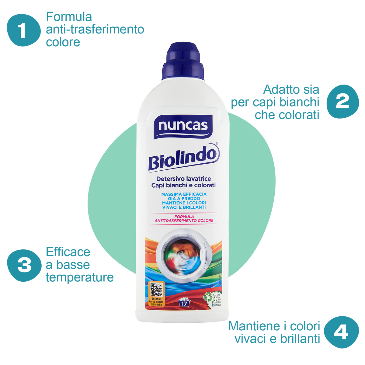 Biolindo è un detersivo per lavatrice efficace già a 30°C, è ideale sia per i capi bianchi che per quelli colorati. Grazie all'innovativa formula sviluppata da Nuncas, permette di lavare insieme capi di colori differenti oltre a tessuti a righe o fantasia.