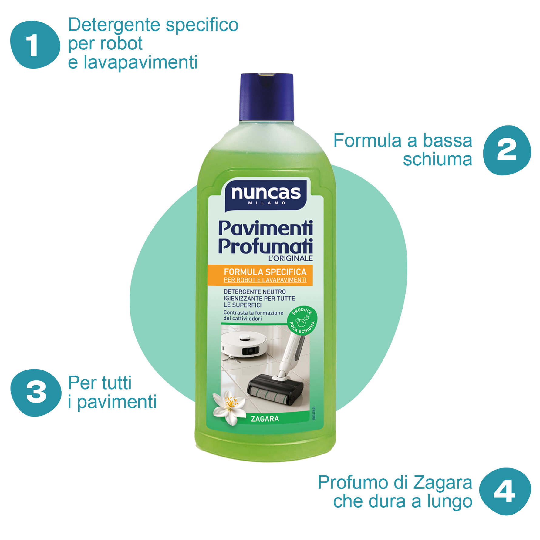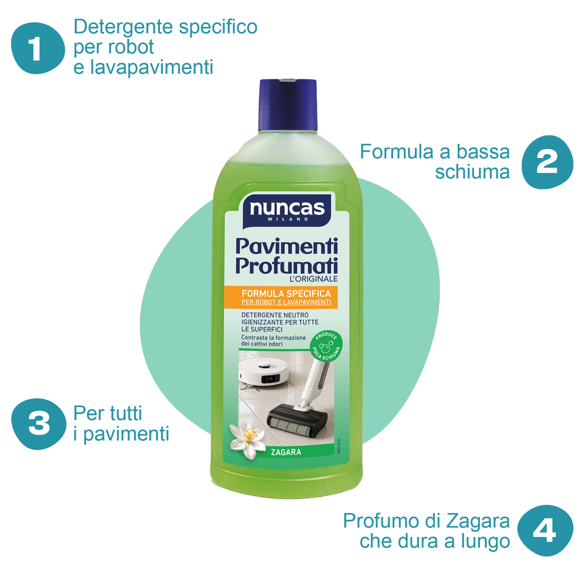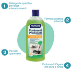 Con il robot lavapavimenti, le pulizie diventano semplici e meno faticose. Per ottenere risultati impeccabili, affidati al nuovo Pavimenti Profumati Nuncas. La sua formula è specifica per robot e lavapavimenti: è un detergente a bassa schiuma e a pH neutro, sicuro su tutte le superfici, anche le più delicate.