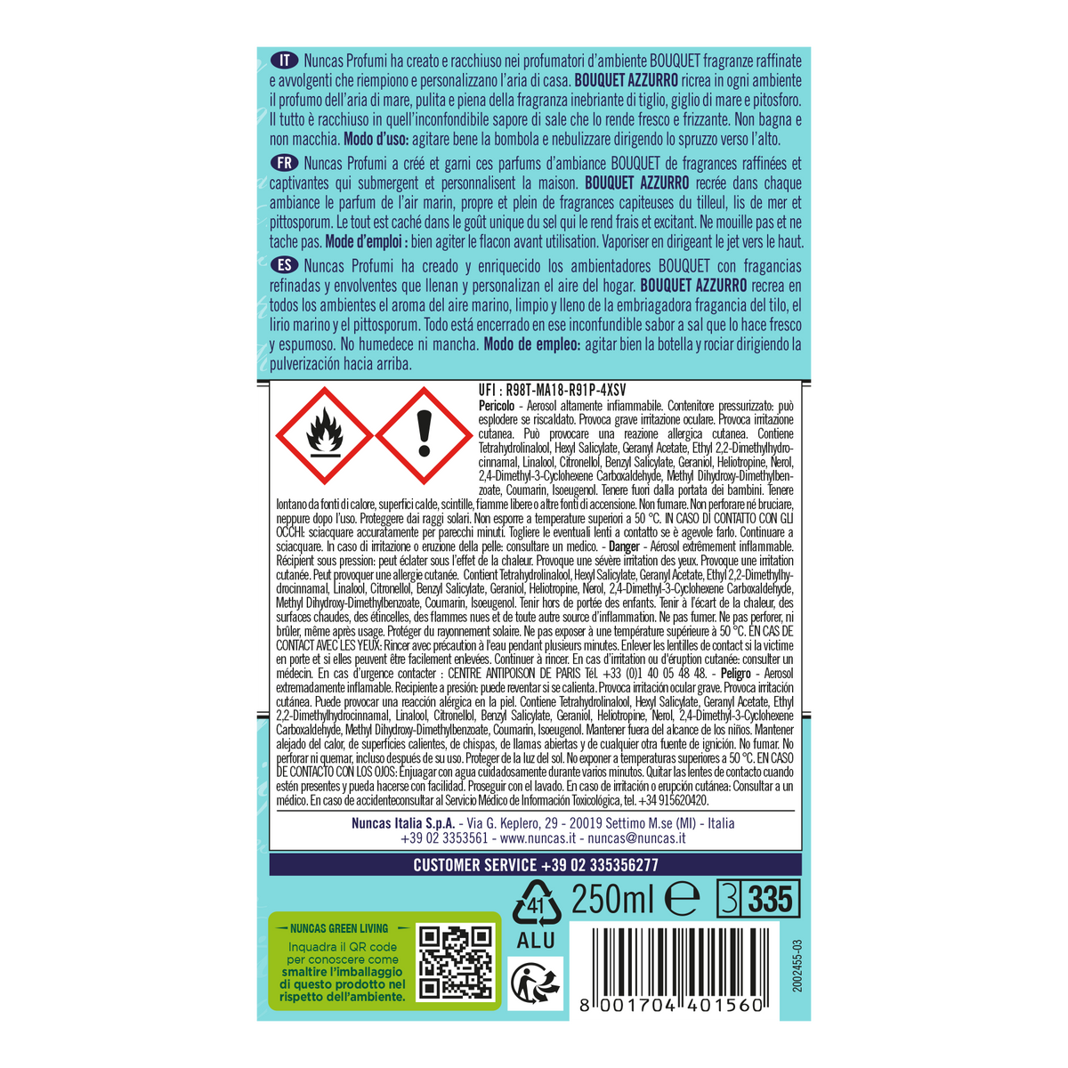 Questa linea di Fragranze per Ambiente Nuncas Bouquet è un'accurata selezione di fragranze di alta profumeria: raffinate e accattivanti, invadono e personalizzano la casa. Questo profumo Azzurro evoca un'atmosfera, un luogo, un momento indimenticabile!