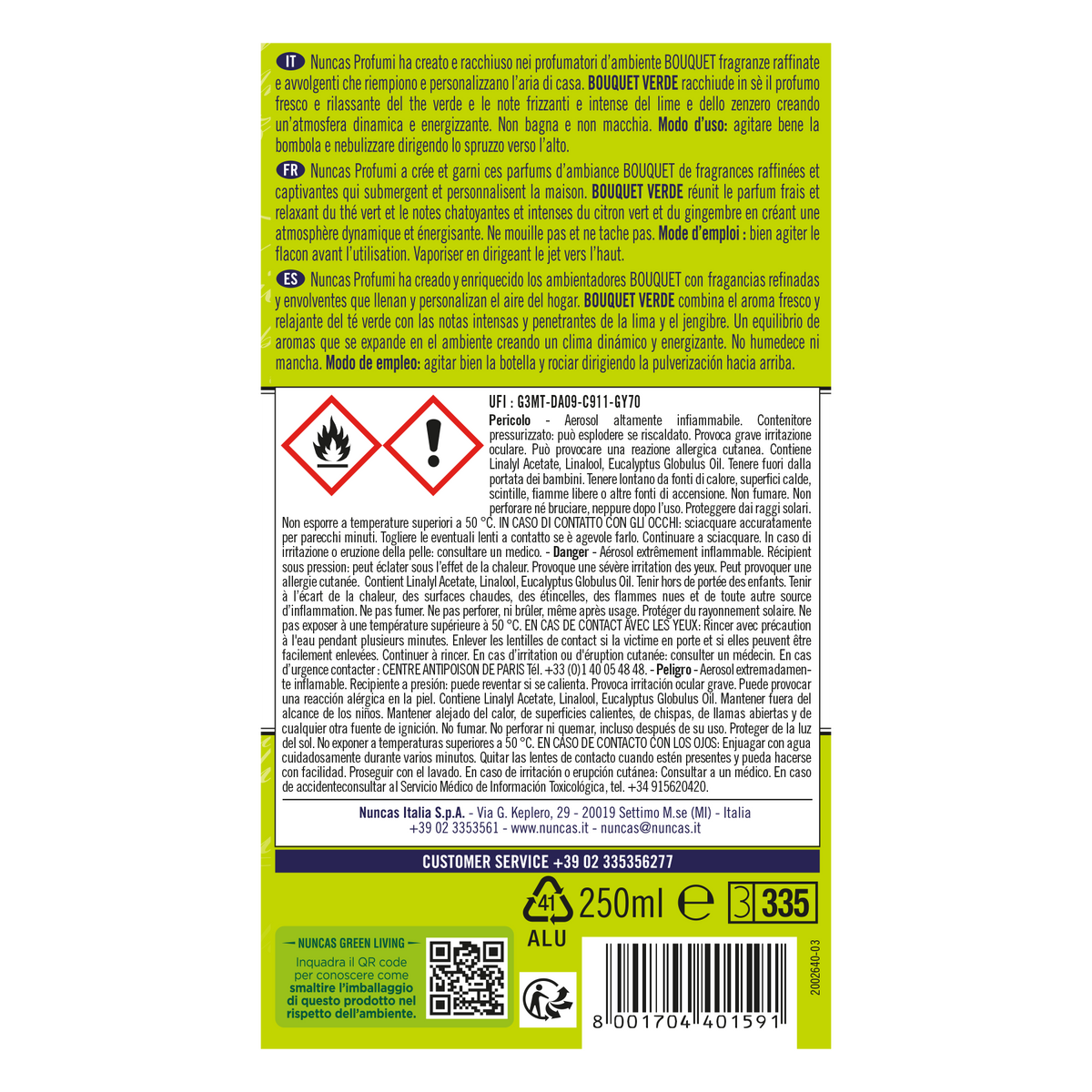 Questa linea di Fragranze per Ambiente Nuncas Bouquet è un'accurata selezione di fragranze di alta profumeria: raffinate e accattivanti, invadono e personalizzano la casa. Questo profumo Verde evoca un'atmosfera, un luogo, un momento indimenticabile!