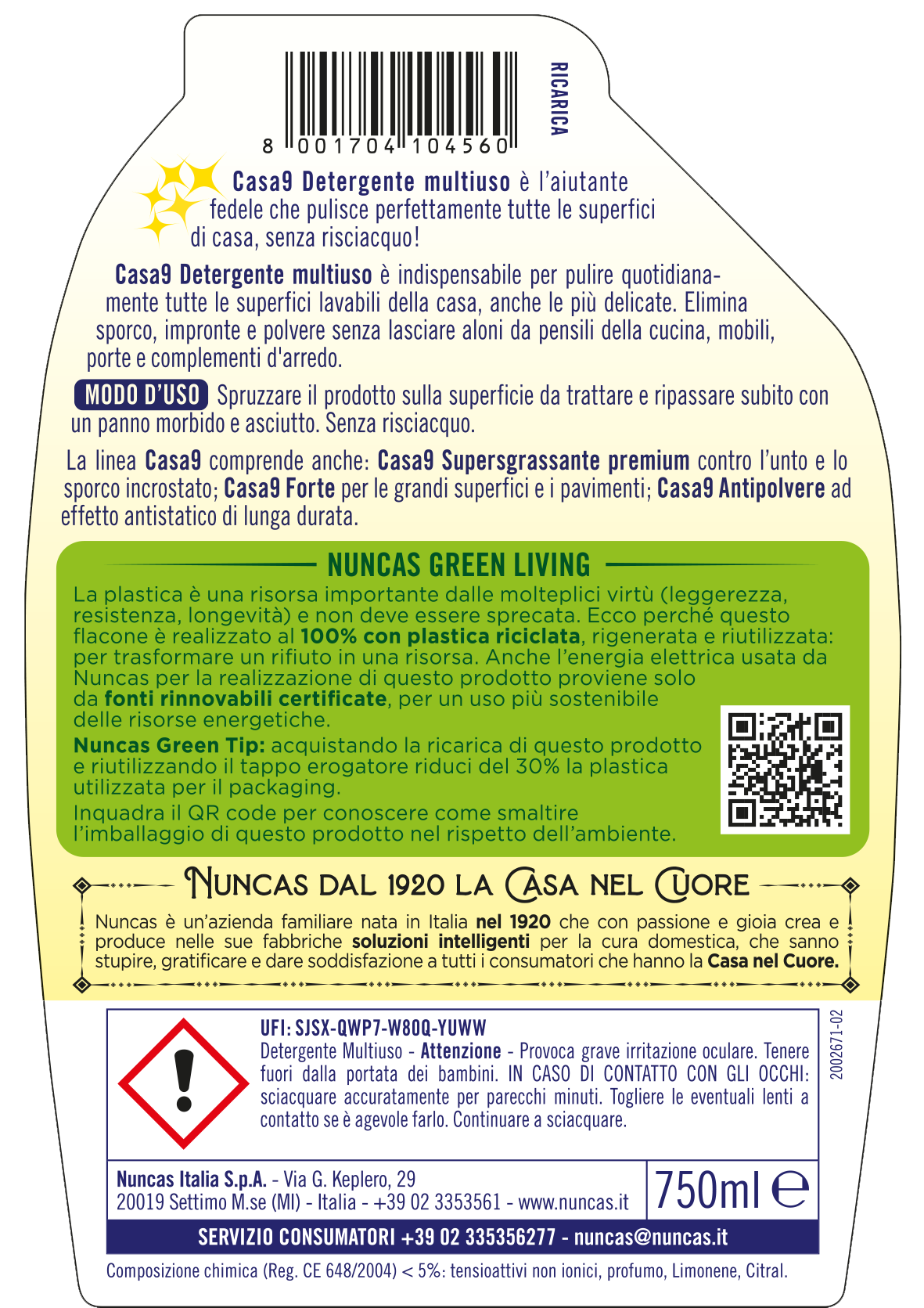 Casa9 Detergente Multiuso Ricarica di Nuncas è un detergente appositamente studiato per la pulizia quotidiana di tutte le superfici lavabili della casa, anche le più delicate (metallo smaltato, legno laccato lucido o opaco, Corian e Cristal Plant).