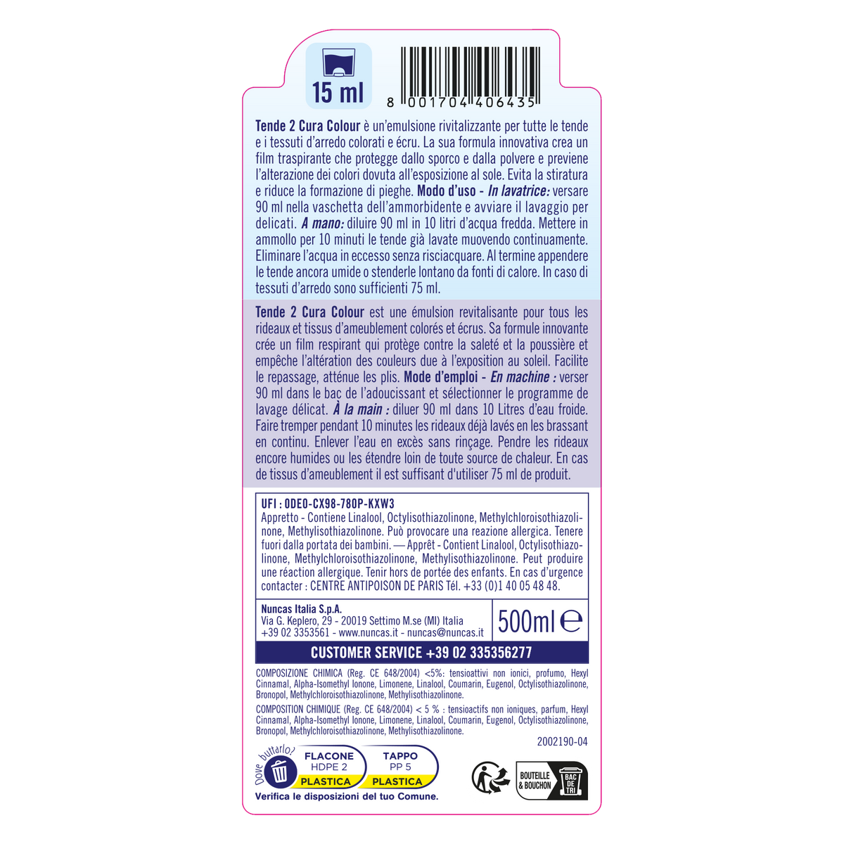 Nuncas Tende 2 Colour Cura è l'additivo rivitalizzante che rinnova, protegge e appretta ogni tipo di tenda. Crea sulle fibre uno speciale e sottilissimo film protettivo, capace di attrarre lo sporco, mantenendo intatto e preservato il tessuto.