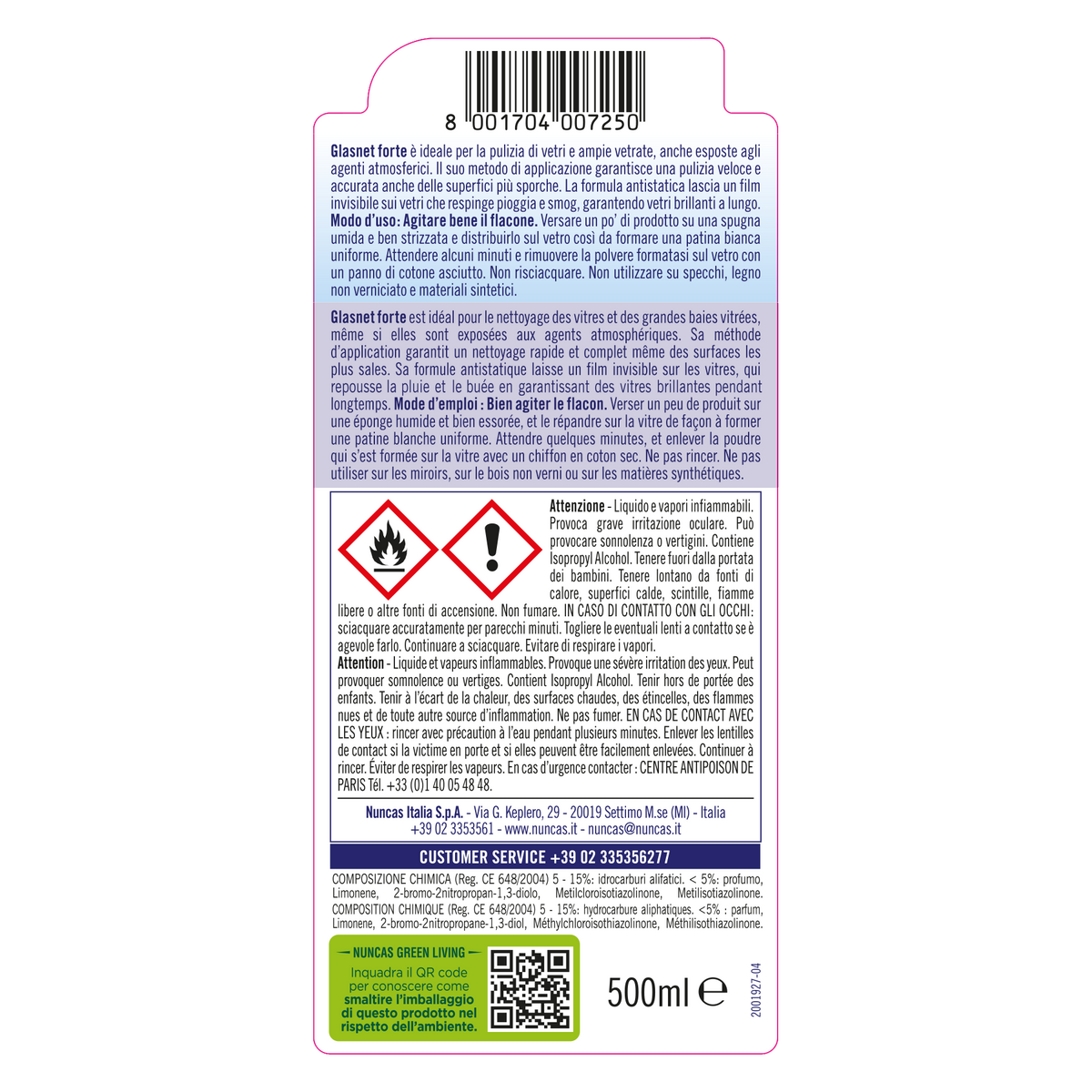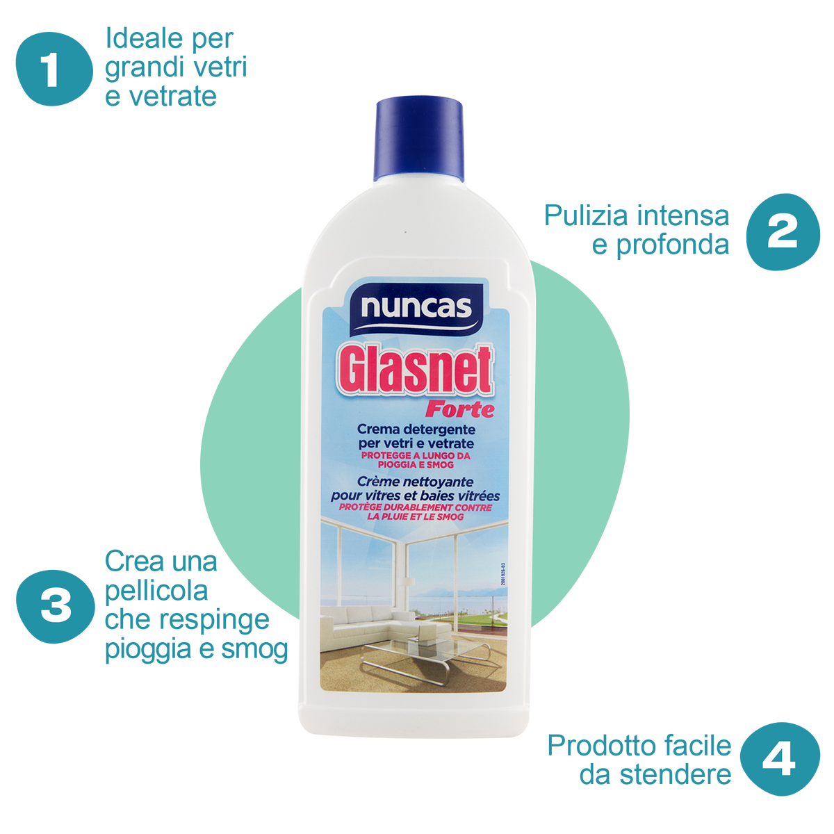 Glasnet Forte Crema Detergente Grandi Vetri e Vetrate, un detergente vetri specifico di Nuncas per la pulizia di grandi vetrate interne ed esterne, esposte allo smog e alla pioggia.