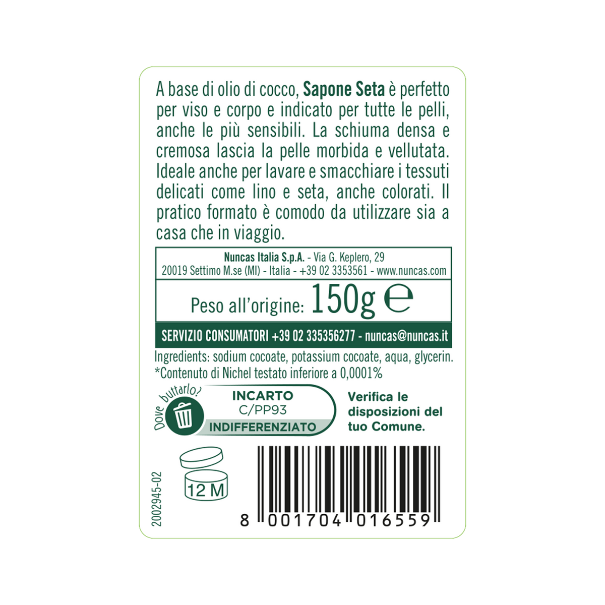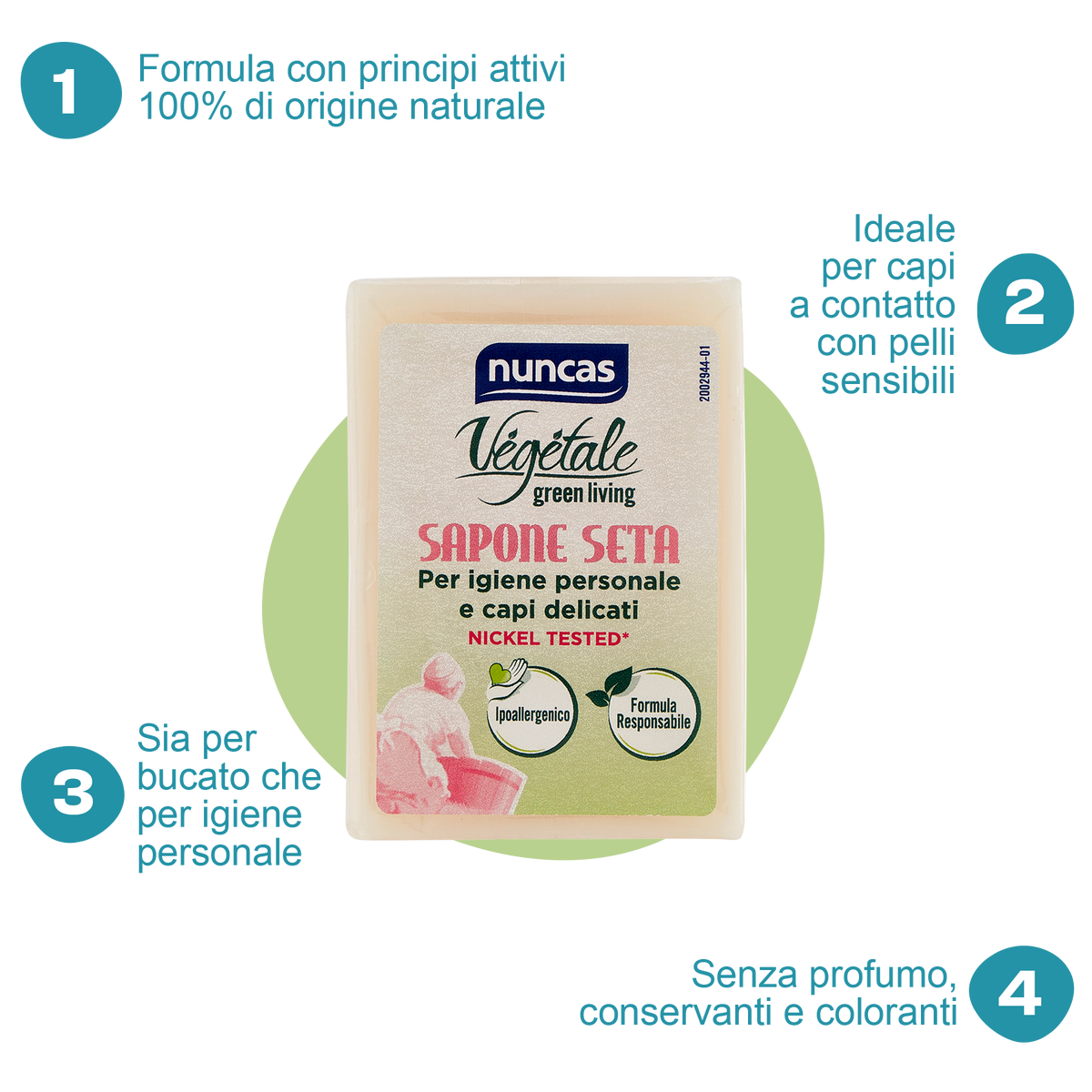 Vegetale Sapone Seta Igiene di Nuncas è idoneo sia per il lavaggio dei capi, sia per l'igiene personale. La totale assenza di profumo, conservanti e coloranti e l'alto contenuto di glicerina garantiscono il massimo rispetto della pelle.