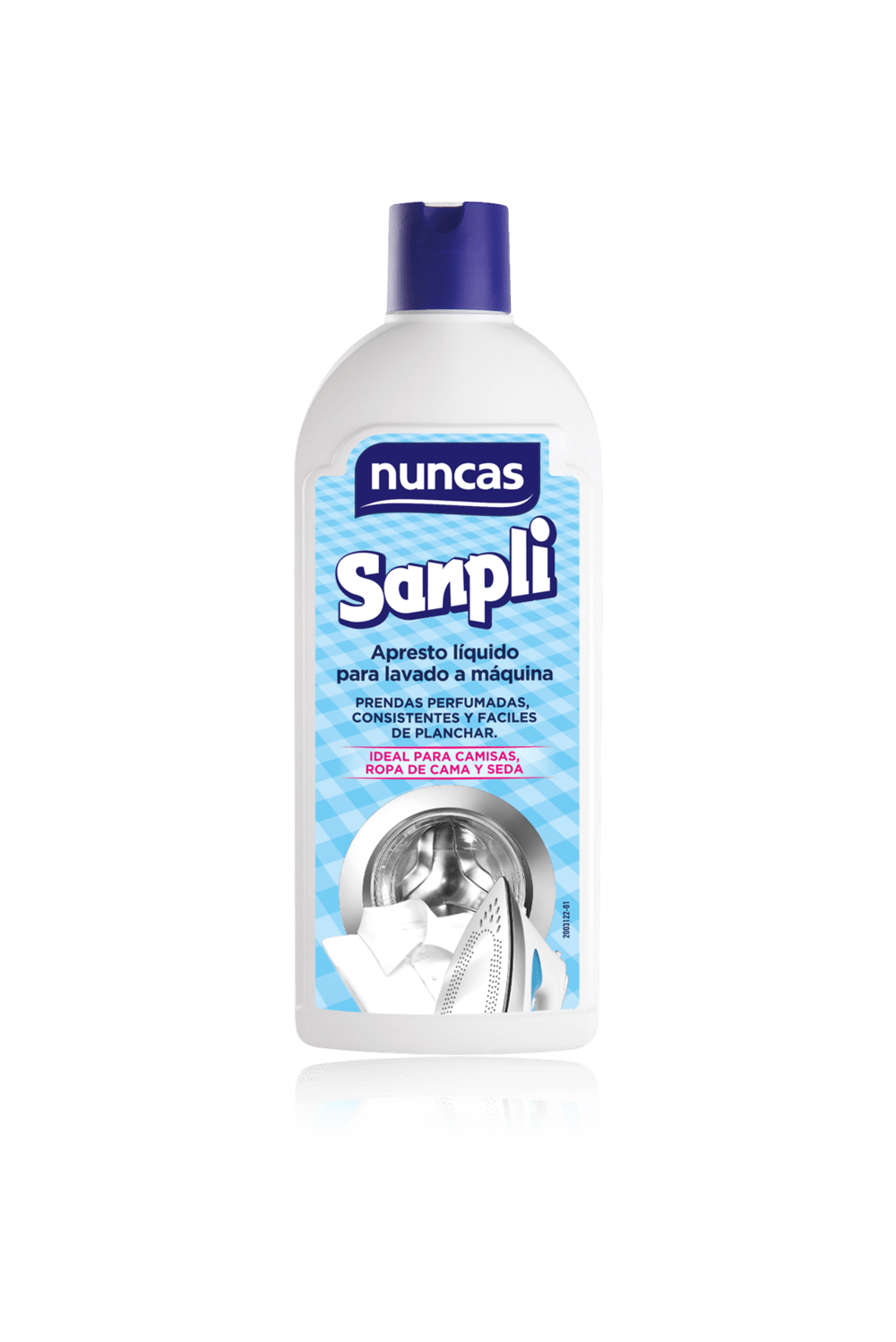Nuncas Sanpli Lavadora es un almidón líquido que añadido al agua del aclarado final se distribuye uniformemente dando consistencia al tejido y facilitando el planchado de camisas, sábanas y textil del hogar.
