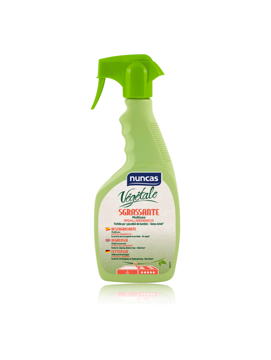 Desengrasante Vegetal Multiusos Nuncas a base de alcohol orgánico elimina rápidamente el polvo, las manchas y toda la grasa de la cerámica, madera pintada o laminada, así como materiales plásticos, sin quitar las manchas. Tiene una fórmula con ingredientes hipoalergénicos, no agresivos, que no alteran la película hidrolipídica de la piel y no provocan irritación. Probado dermatológicamente, no contiene sustancias alérgicas y su contenido de níquel natural está garantizado porque es inferior al 0,00001%, por lo que es seguro decir que el umbral de la piel es seguro para quienes son alérgicos.