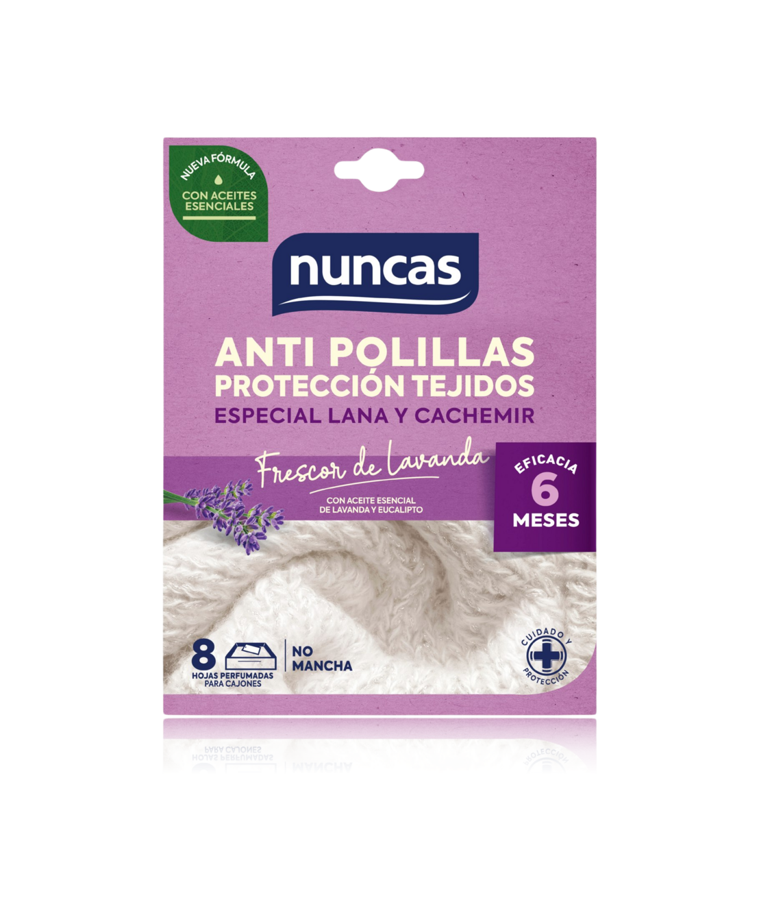 Antipolillas Proteccion Tejidos Frescor de Lavanda, un nuevo concepto antipolillas contenido en un soporte especial de celulosa. Caracterizado por un perfume refinado - Lavanda Fresca - capaz de difundirse agradablemente en los ambientes. Este paquete incluye 8 hojas.