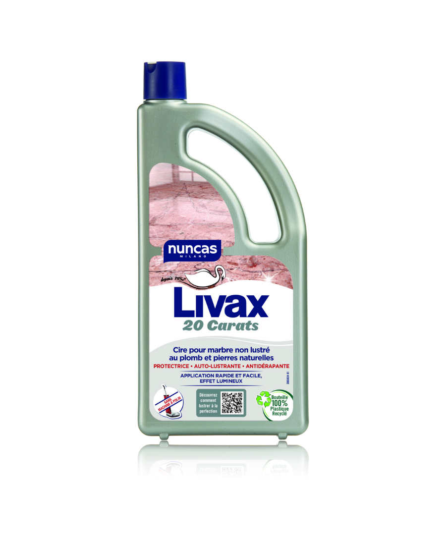 Livax 20 Carats est un protection cirante métallisée spécialement étudiée pour le marbre naturel poli au plomb. Sa formule spéciale de Nuncas, à base de cires très fines à fort pouvoir réflecteur, dépose sur la surface un film protecteur qui préserve la couleur et la beauté d'origine, empêchant l'absorption de poussière, d'eau et l'apparition de taches facilitant ainsi le nettoyage quotidien.