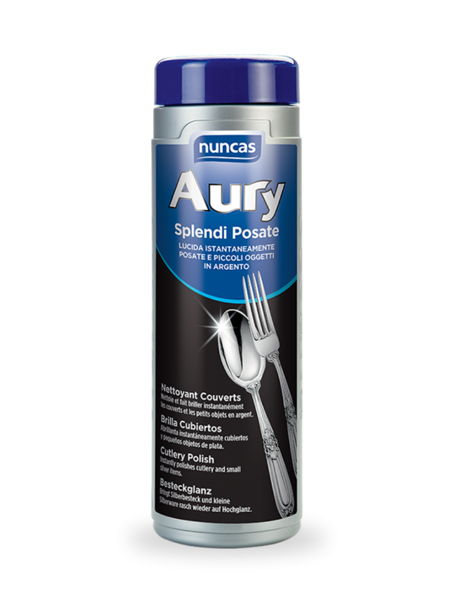 Aury Brilla Cubiertos de Nuncas es un producto abrillantador líquido por sumersión, estudiado para la limpieza rápida y eficaz de cubiertos y pequeños objetos de plata. Actúa en un sólo segundo, por tanto, está especialmente indicado para abrillantar servicios completos de mesa. Gracias al práctico cesto situado dentro del contenedor, facilita la operación a realizar. La eficacia superior de su fórmula elimina completamente la oxidación y vuelve a dar a la plata su esplendor natural. Fácil de aclarar, no deja residuos en los cubiertos y puede utilizarse de modo seguro.