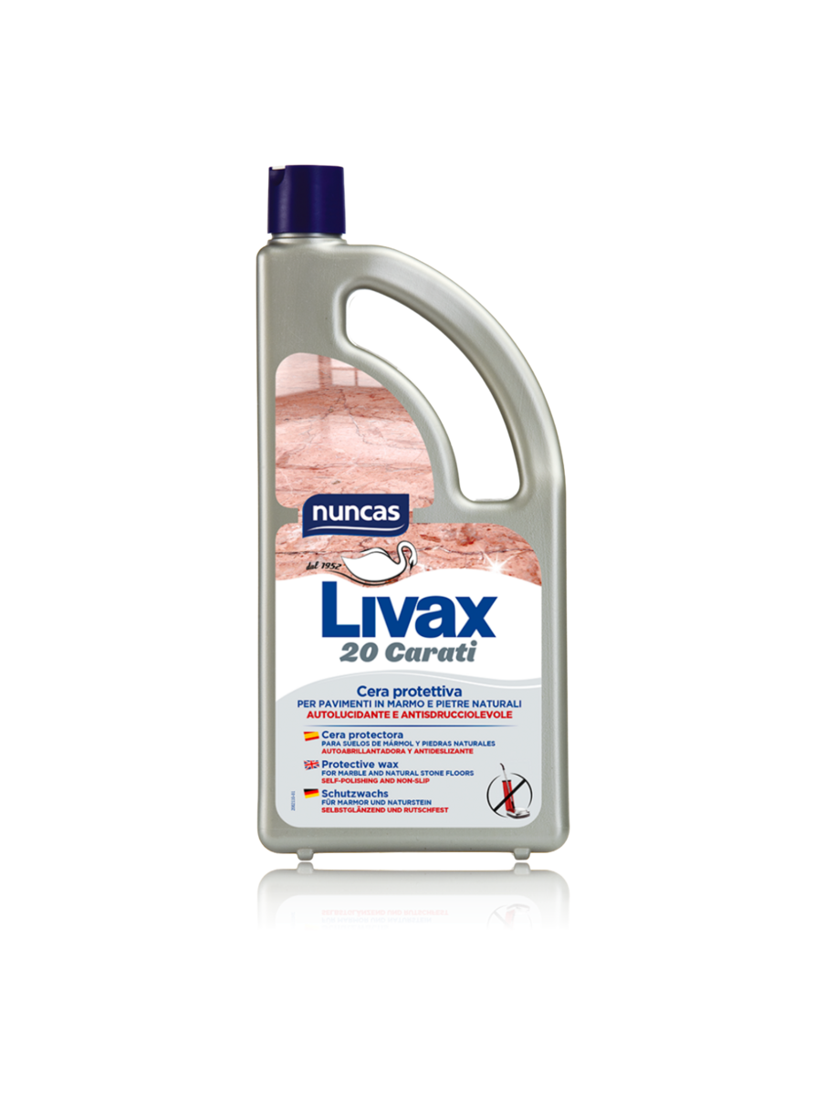 Nuncas Livax 20 carati es la cera metalizada auto abrillantadora estudiada para dar el máximo brillo a todo tipo de suelos modernos de mármol, granilla y piedras naturales similares. Debido a su elevado contenido en cera, deja sobre la superficie una película protectora que permanece inalterada durante seis meses, impermeabilizando la superficie y previniendo el desgaste. Sus ingredientes, cuidadosamente seleccionados, son totalmente incoloros: por ello, Emulsion Metalizada es ideal para el tratamiento de los modernos mármoles blancos y del travertino.