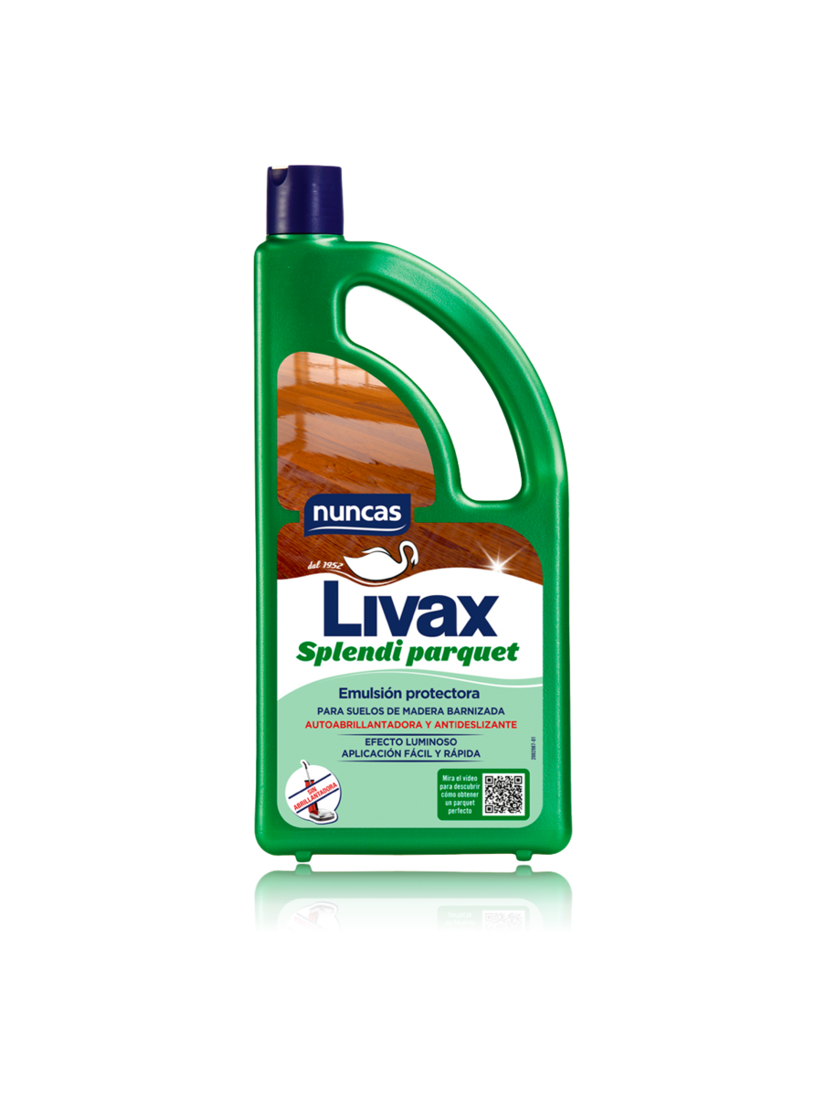 Nuncas Livax Splendi Parquet es una cera abrillantadora estudiada expresamente para proteger y abrillantar todo tipo de parqués barnizados, sin necesidad de pasar la pulidora. Su fórmula delicada protege el barniz del suelo del desgaste y de las pisadas diarias que pueden rayarlo y hacerla opaca y mantiene la belleza del parqué durante más tiempo, preservando su esplendor original. Además de ser antiresbalamiento, está enriquecida con componentes detergentes que permiten incluso el uso diluido para facilitar y agilizar el mantenimiento.