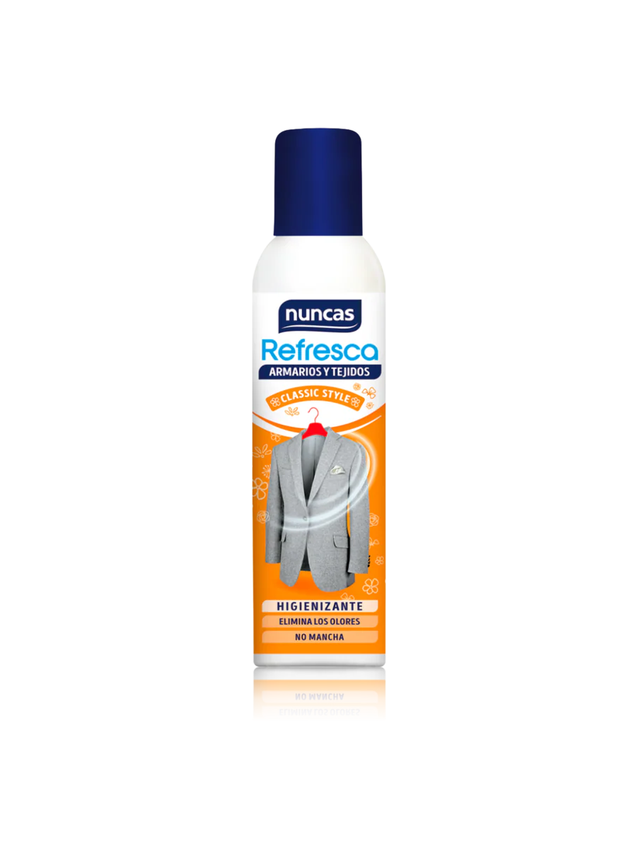 Refresca Chaquetas y Tejidos El Antiolor Spray Estilo Clásico elimina los olores desagradables que se depositan en todos los tejidos: Humor, Confort y ambientes cerrados. Gracias a la fórmula antiaceite, devuelve el frescor y la higiene a la ropa lavada.