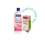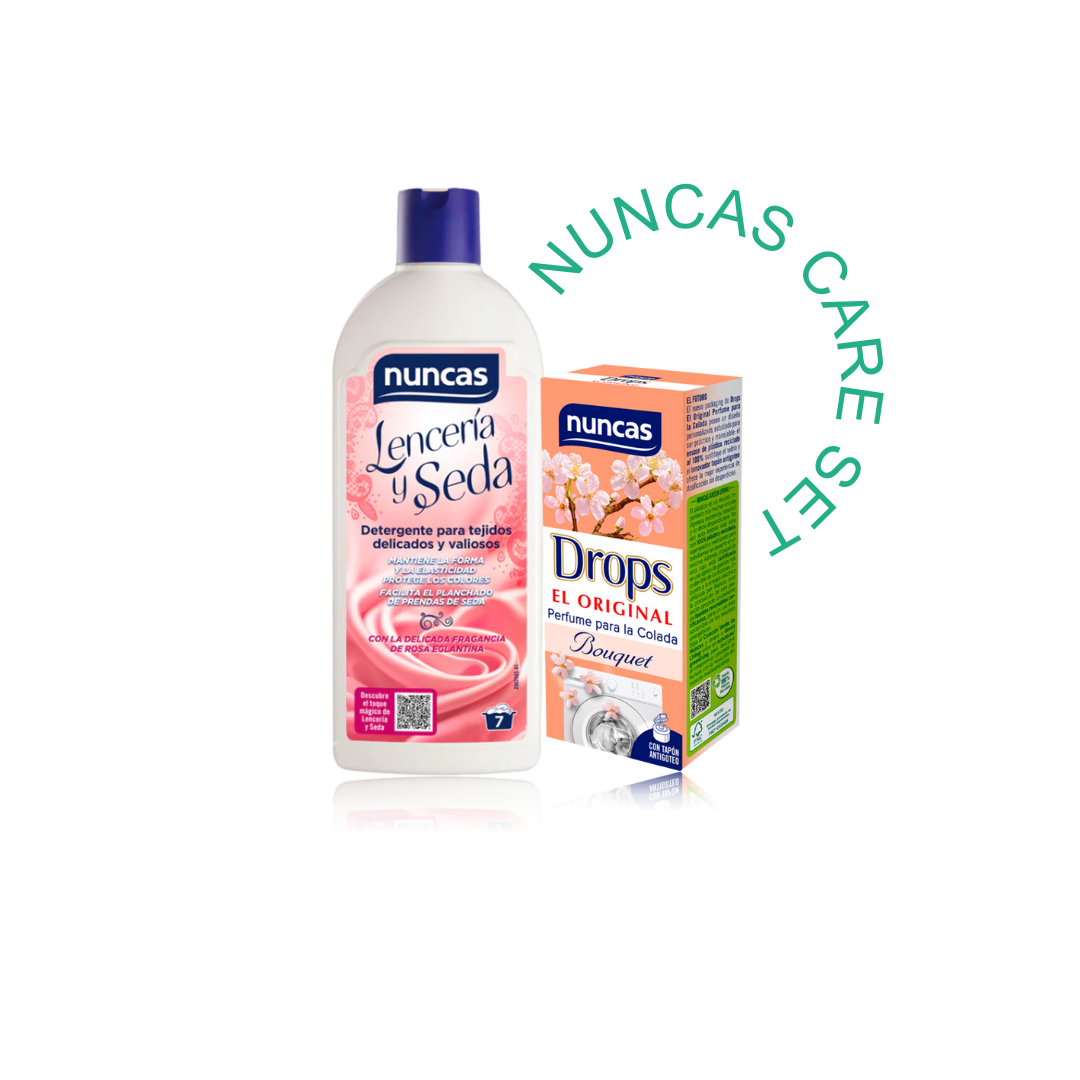 El Care Set “Soft Touch” de Nuncas es la solución ideal para lavar seda y lencería. Un kit diseñado para proteger los tejidos delicados y envolverlos en una fragancia duradera. El detergente Lencería y Seda conserva la suavidad, el color y la forma de la seda, el encaje y la lencería, mientras que Drops - Perfume para Ropa - Bouquet Blanc deja aroma sutil y refinado de ramo blanco que perdura.