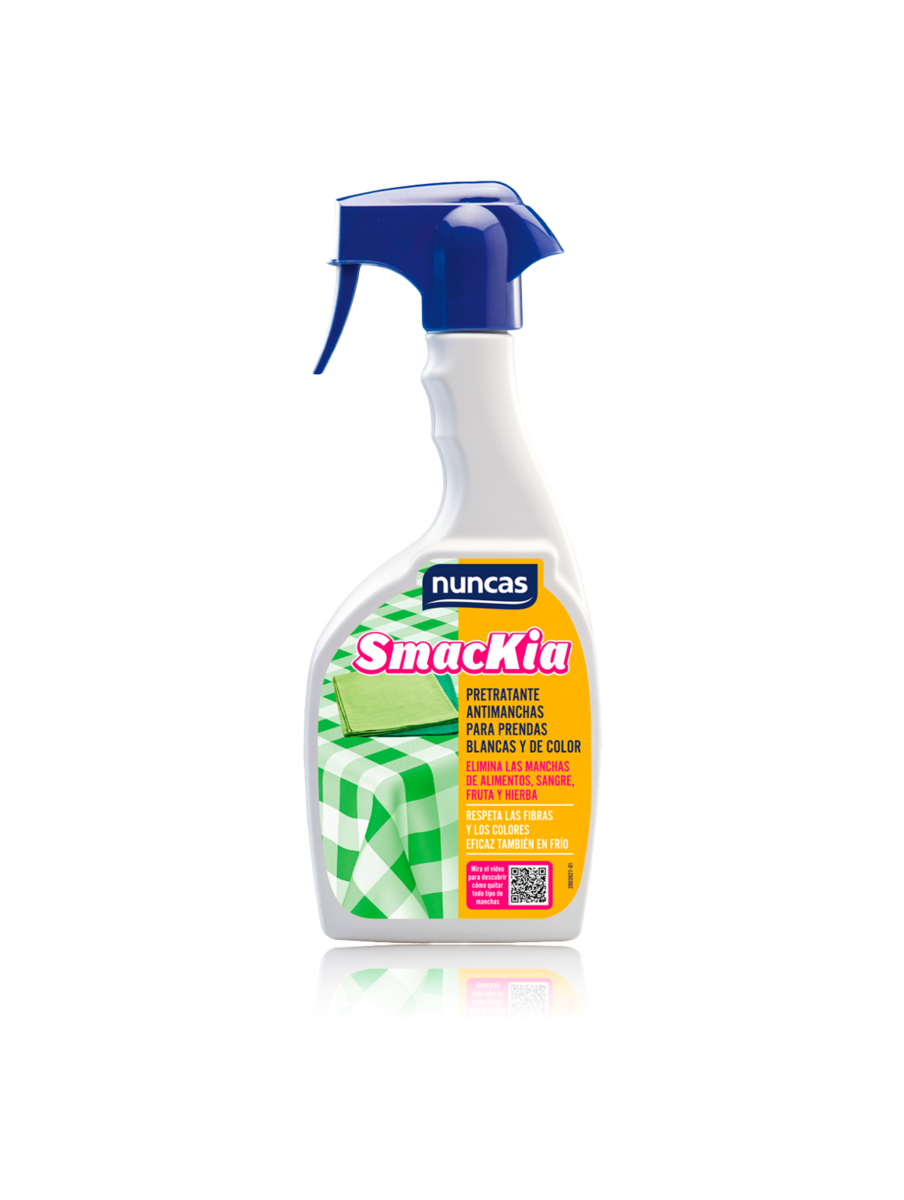 Smackia pre-desmanchante para la colada es un quitamanchas específico para el tratamiento de manchas localizadas. Está enriquecido con enzimas y jabón vegetal. Actúa contra las manchas grasas como mantequilla, aceite o grasa lubrificante, y contra las manchas enzimáticas como huevo, leche, yogur, quesos, chocolate y cacao.