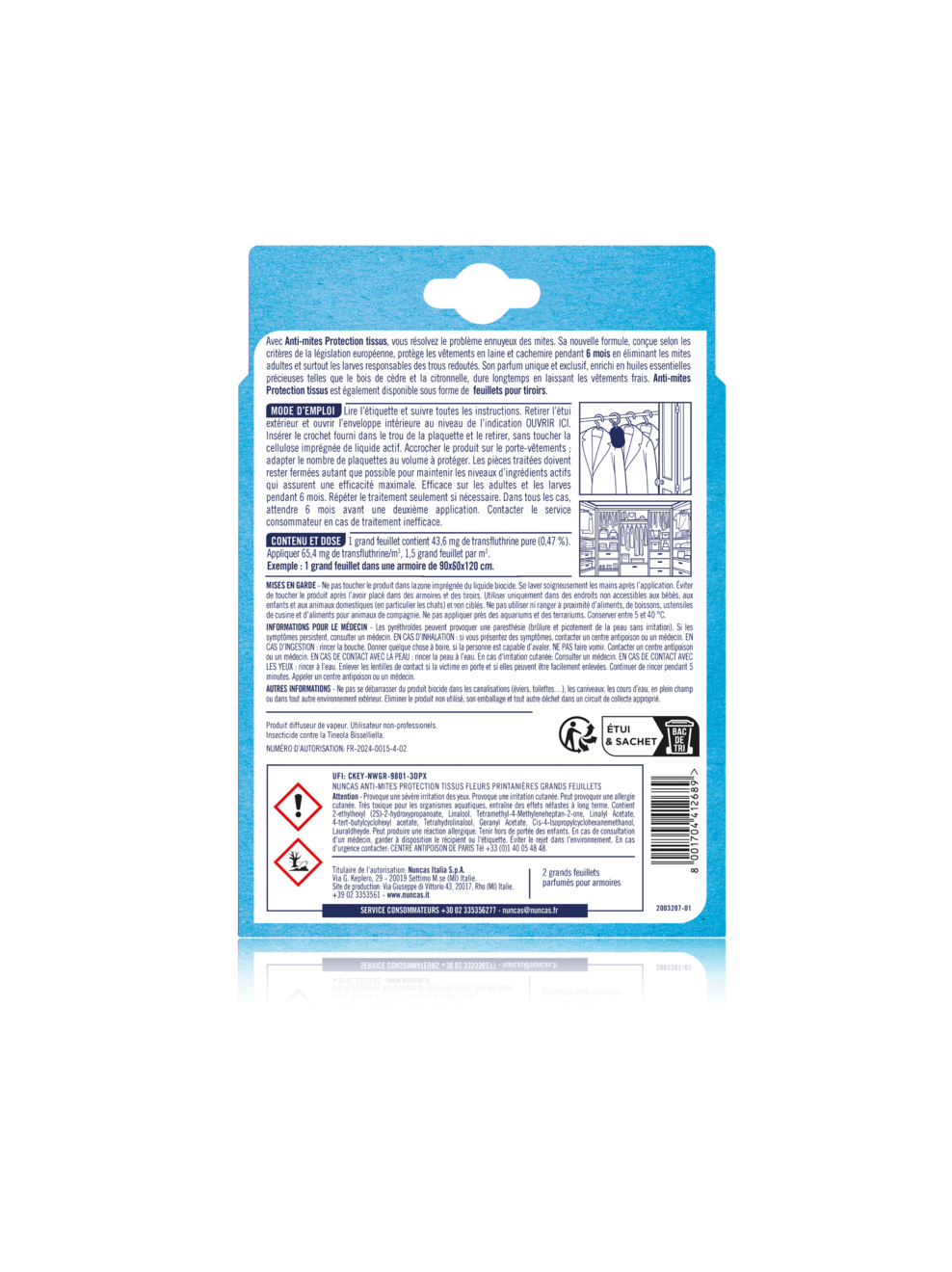 Antimites Protection Tissus Grands Feuillets Fleurs Printanières, un nouveau concept de dosette antimites réalisée avec un support spécial en cellulose. Il se caractérise par un parfum raffiné - Fleurs Printanières - capable de se diffuser agréablement dans les environnements. Ce forfait comprend 2 dosettes.