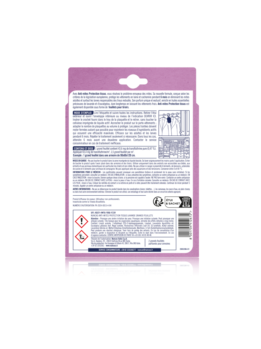 Antimites Protection Tissus Grands Feuillets Lavande, un nouveau concept de dosette antimites réalisée avec un support spécial en cellulose. Il se caractérise par un parfum raffiné - Lavande fraîche - capable de se diffuser agréablement dans les environnements. Ce forfait comprend 2 dosettes.