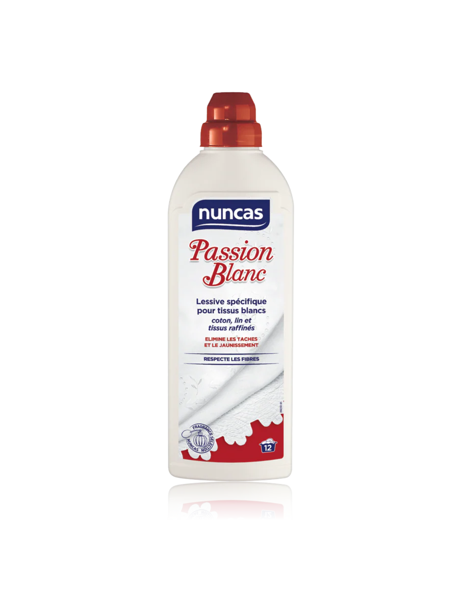 Passion Blanc est une lessive spécifique pour laver votre linge à la main ou en machine, conçue pour redonner la beauté originelle à vos tissus blancs et délicats. Sa formule spéciale Nuncas est active à basse température et élimine efficacement les taches et le jaunissement les plus tenaces dus au temps, tout en respectant totalement les fibres.