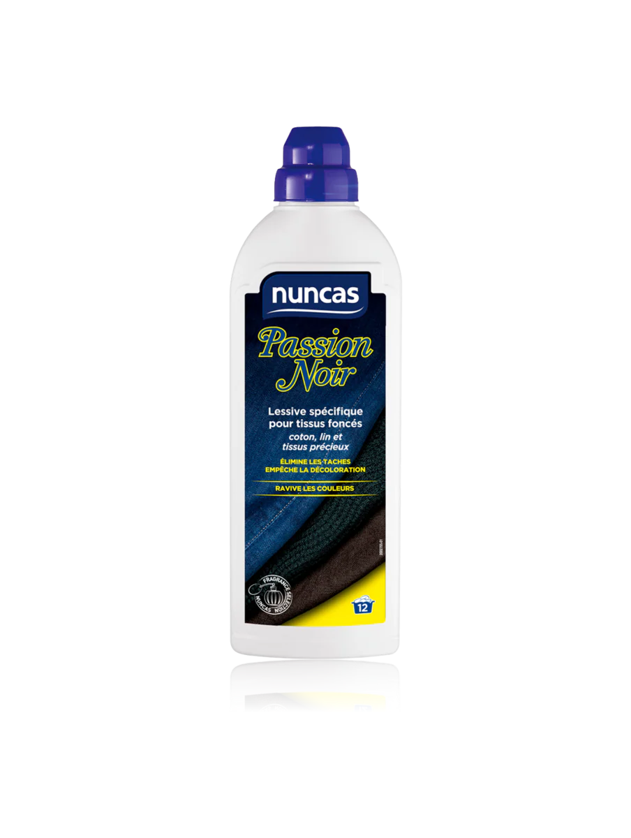 Passion Noir est un lessive spécifique idéale pour préserver la brillance des couleurs foncées des vêtements en coton, lin viscose et fibres synthétiques. Sa formulation spéciale de Nuncas est également active à froid et permet une élimination efficace de la saleté et des taches les plus tenaces.