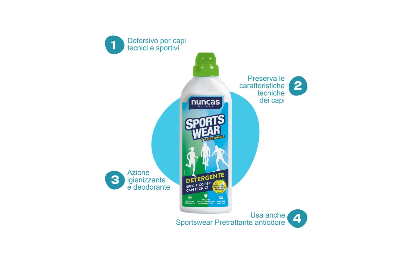 Il detergente per capi tecnici, lava in profondità e rigenera i tessuti e gli accessori sportivi, anche i più tecnici ed innovativi. Efficace a basse temperature sulle macchie e lo sporco tipico dello sport.