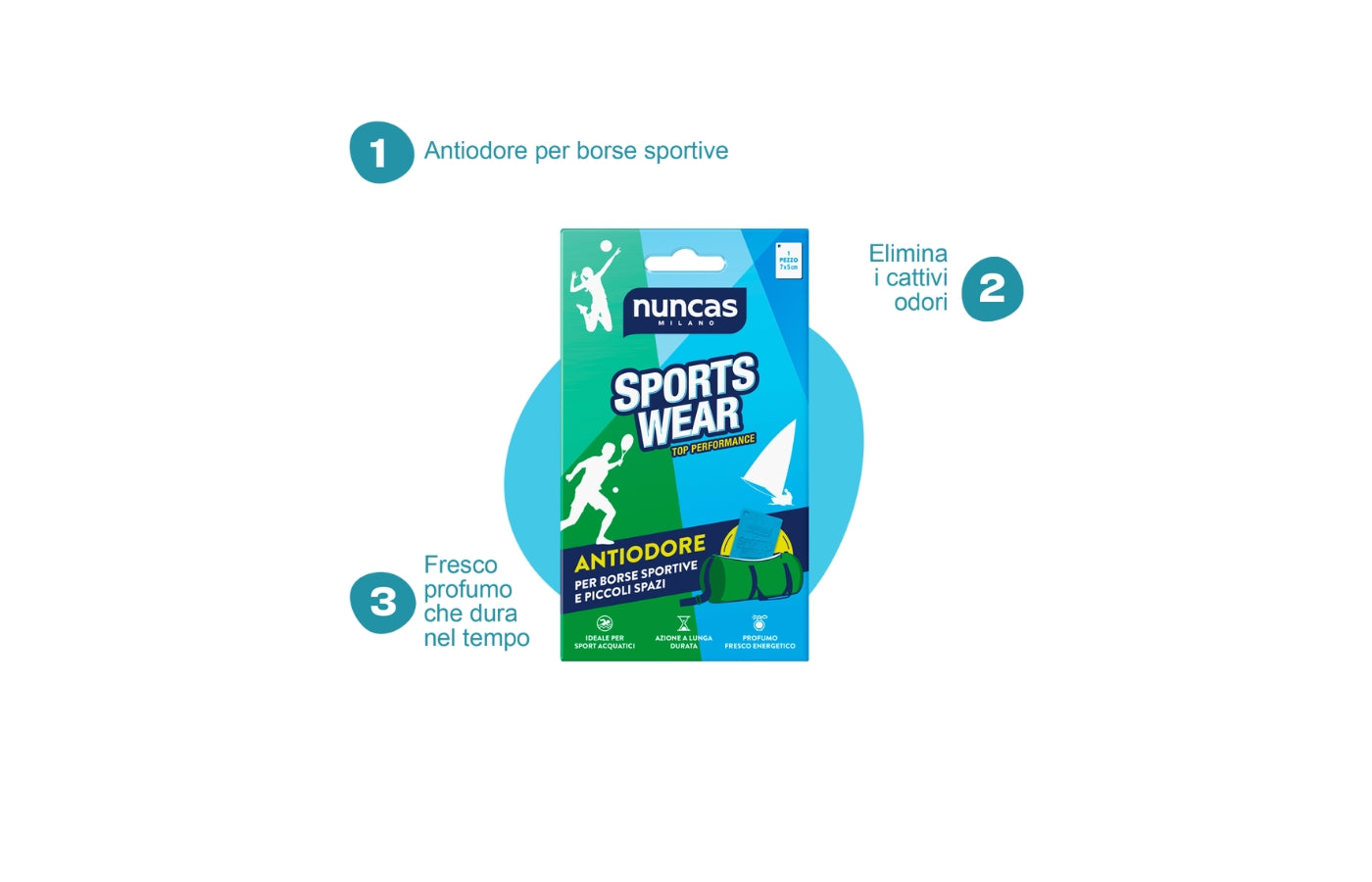 Il deodorante per borse sportive e armadietti da palestra. Il suo fresco profumo elimina i cattivi odori e rimane a lungo, garantendo un effetto deodorante persistente. Ideale anche per le borse delle scarpe e gli interni delle valigie.