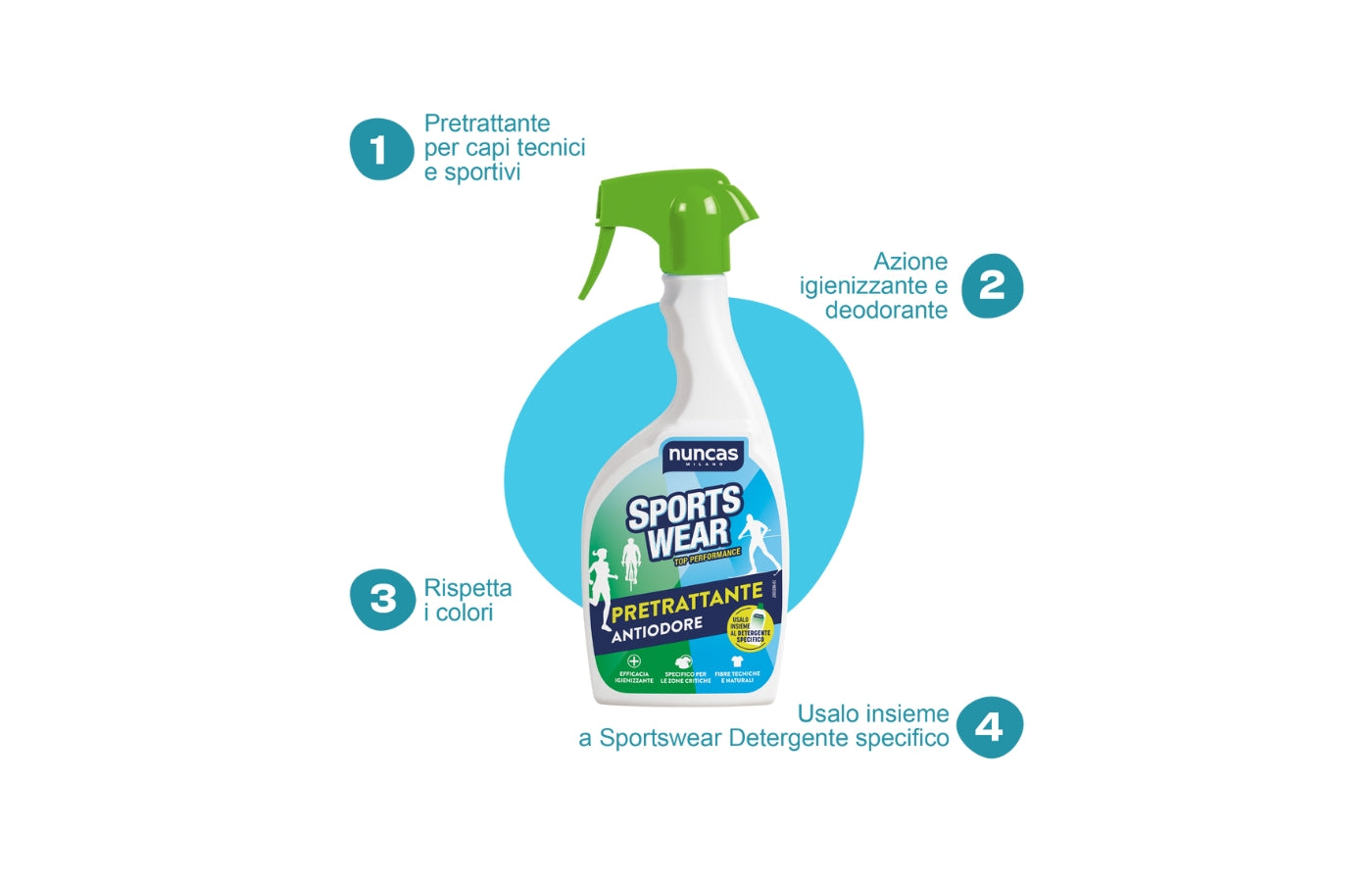 Il pretrattante specifico per capi sportivi. Elimina il cattivo odore lasciando i capi deodorati e igienizzati anche durante il successivo utilizzo.
