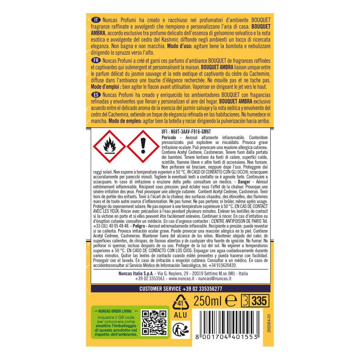 Questa linea di Fragranze per Ambiente Nuncas Bouquet è un'accurata selezione di fragranze di alta profumeria: raffinate e accattivanti, invadono e personalizzano la casa. Questo profumo Ambra evoca un'atmosfera, un luogo, un momento indimenticabile!
