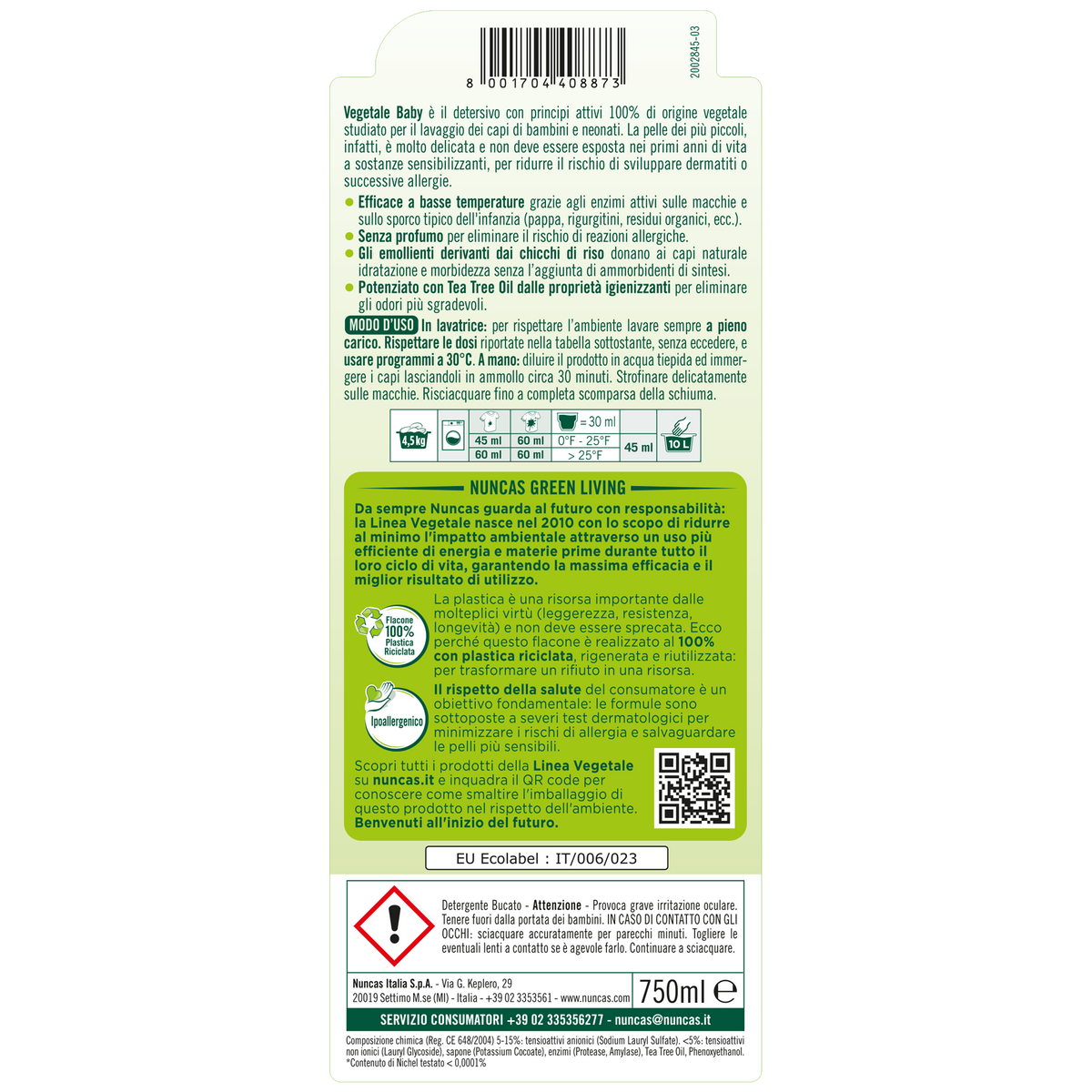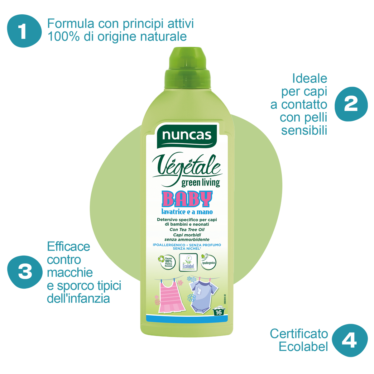 Vegetale Detergente Specifico Baby agisce contro lo sporco tipico dell’infanzia (residui organici, vomito, macchie da cibo) già alle basse temperature e grazie alla presenza di ingredienti naturali emollienti derivanti dalla barbabietola da zucchero lascia i capi morbidi senza necessità di aggiungere ammorbidenti. E’ arricchito con Tea Tree oil dalle proprietà antimicrobiche per eliminare anche gli odori più sgradevoli. La speciale formula ipoallergenica non contiene profumo né conservanti e il contenuto di nichel è inferiore allo 0.0001%, soglia sotto la quale anche un soggetto sensibile non manifesta alcuna reazione allergica.
