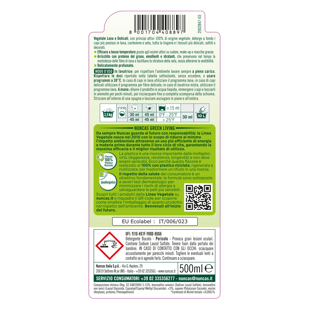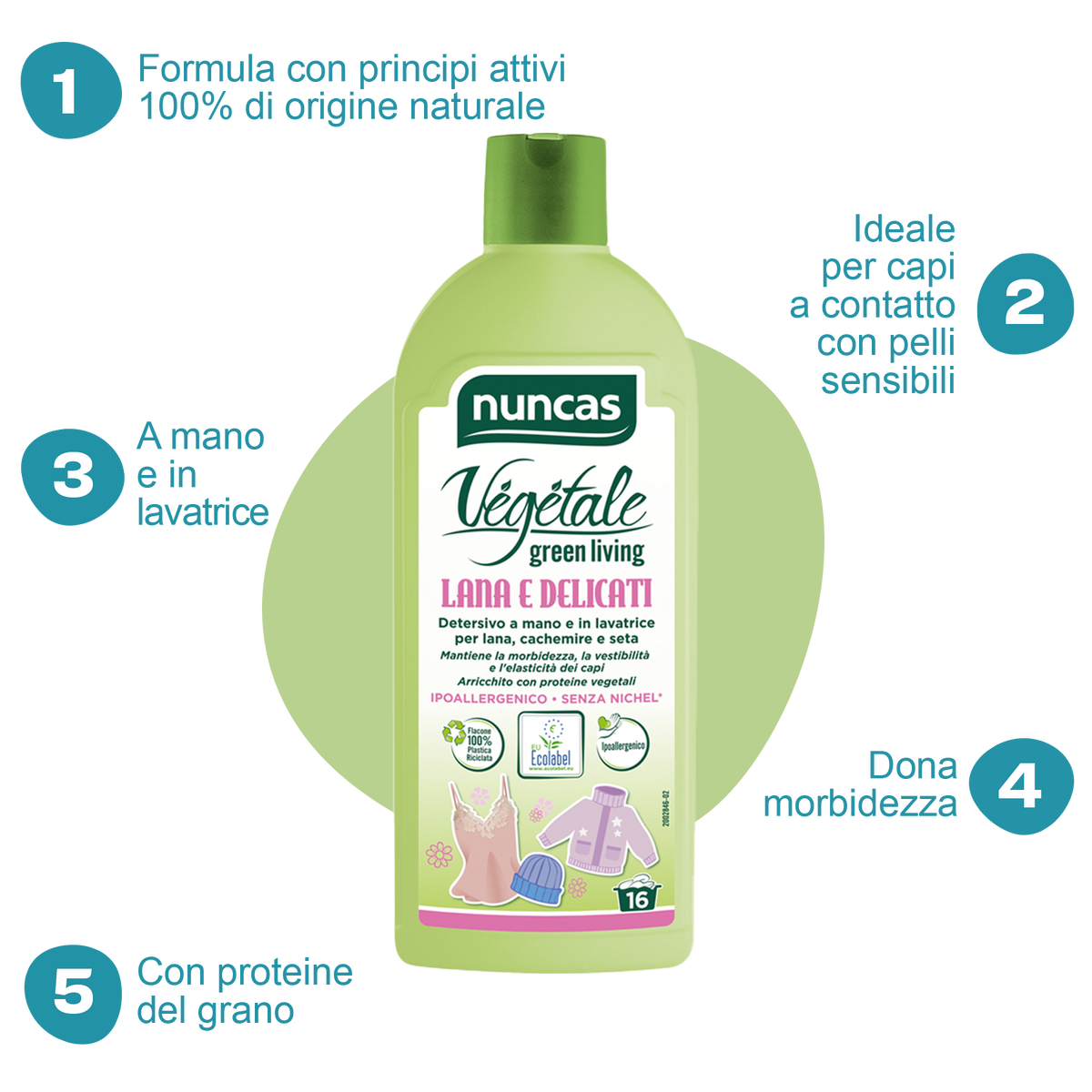 Vegetale Detersivo Lana e Delicati è il detersivo appositamente formulato per il lavaggio in lavatrice e a mano dei capi più preziosi in lana, cachemire e seta, della lingerie e dei tessuti più delicati, sottili o decorati. La formulazione, arricchita con enzimi speciali che non intaccano i tessuti, pulisce a fondo eliminando lo sporco alle basse temperature. Ricco di proteine del grano e di emollienti naturali, lascia i capi morbidi e idratati, senza alterare la loro vestibilità ed elasticità. E’ ipoallergenico, non contiene coloranti e il contenuto di nichel è inferiore a 0,0001% soglia sotto la quale anche un soggetto sensibile non manifesta alcuna reazione allergica.