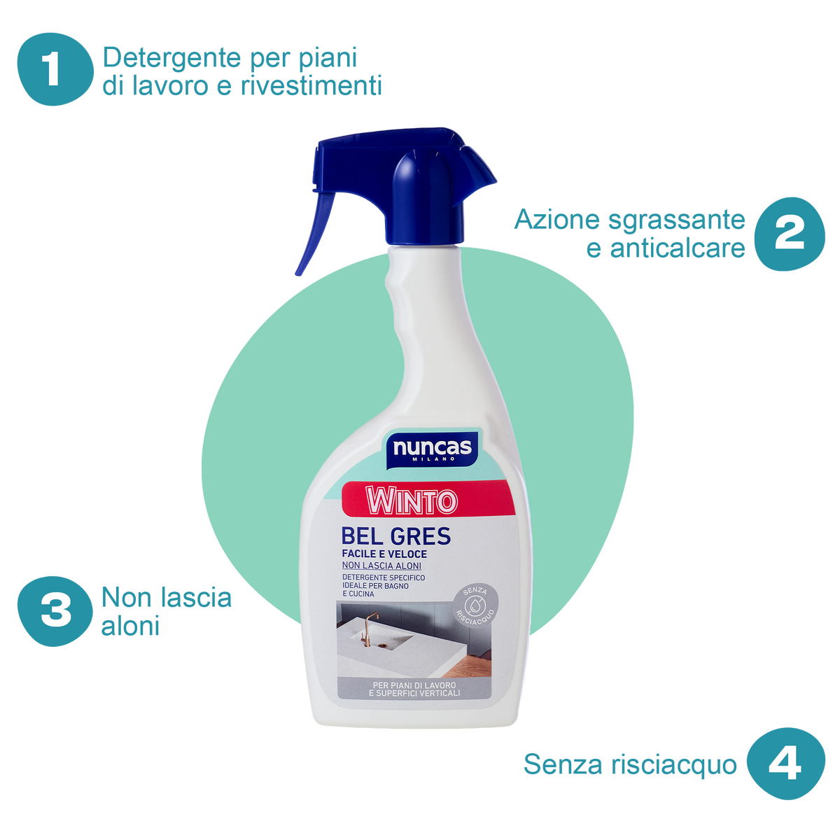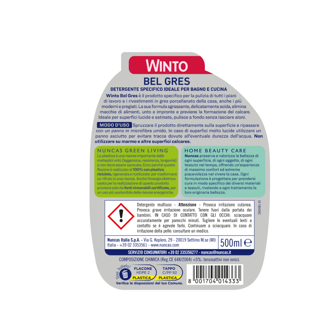 Il gres porcellanato è la scelta ideale per una casa dallo stile moderno ed elegante. Oggi questo materiale è sempre più presente nelle abitazioni: non rappresenta più solo una scelta per i pavimenti ma è anche molto apprezzato per le sue caratteristiche in cucina (piani paraschizzi, ante dei mobili e isole) così come in bagno (piani dei lavabi, rivestimenti delle docce). Il gres porcellanato è tra le opzioni migliori per chi desidera coniugare estetica e durabilità. Sebbene sia molto resistente, questo materiale necessità di una cura particolare che solo un prodotto studiato appositamente per rispettare le sue caratteristiche può offrire come Winto BelGres. Si tratta del nuovo prodotto di Nuncas studiato appositamente per pulire in modo efficace tutti i piani di lavoro e i rivestimenti verticali in gres porcellanato della casa. Grazie alla sua speciale formula ad azione sgrassante e delicatamente acida, elimina in un solo gesto macchie di alimenti, unto e impronte. Utilizzato regolarmente, previene la formazione del calcare così da mantenere superfici sempre brillanti, anche quelle più scure. Non lascia aloni ed è quindi perfetto anche per le finiture lucide e satinate..