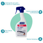 In cucina: sgrassatore multi-superficie, grazie alla presenza di un solvente efficace ma delicato.