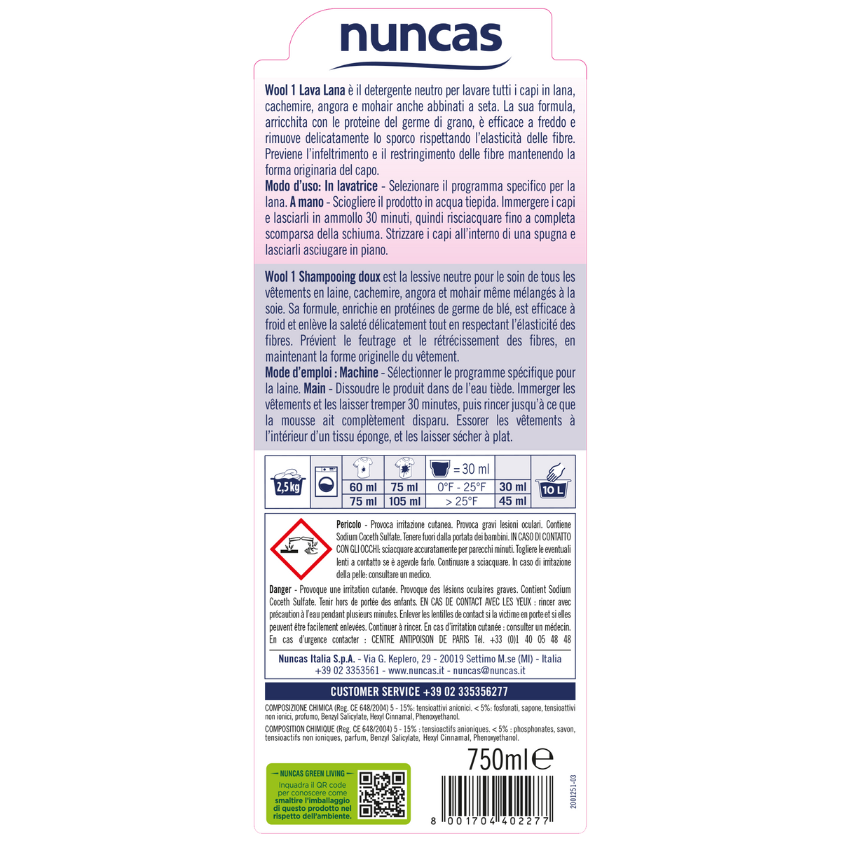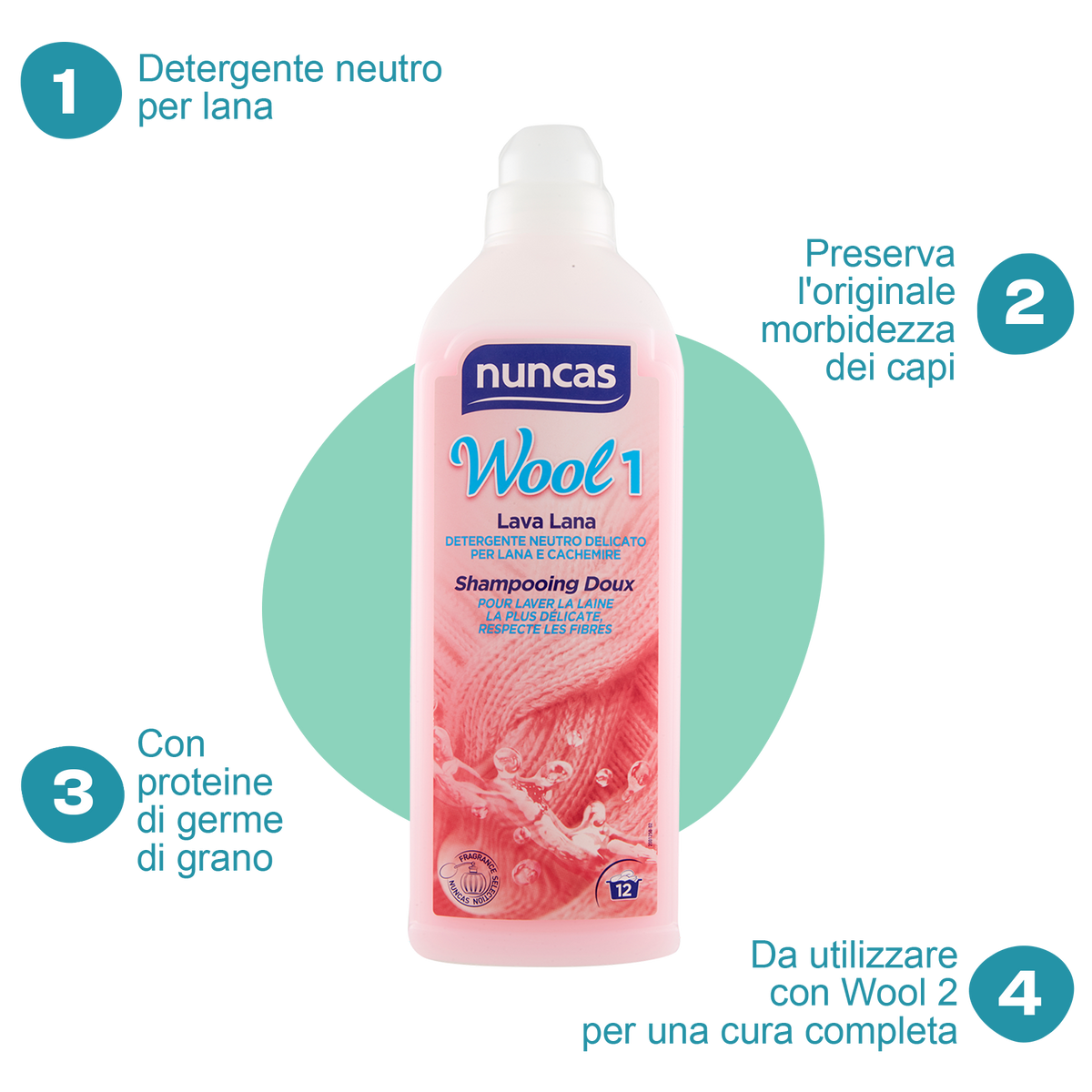 Nuncas Wool 1 detergente neutro delicato lana e cachemire con estratti di origine vegetale specifico per lavare lane pregiate. Elimina polvere e macchie dai capi alle basse temperature preservandone l'originale morbidezza. Può essere utilizzato sia mano sia in lavatrice.