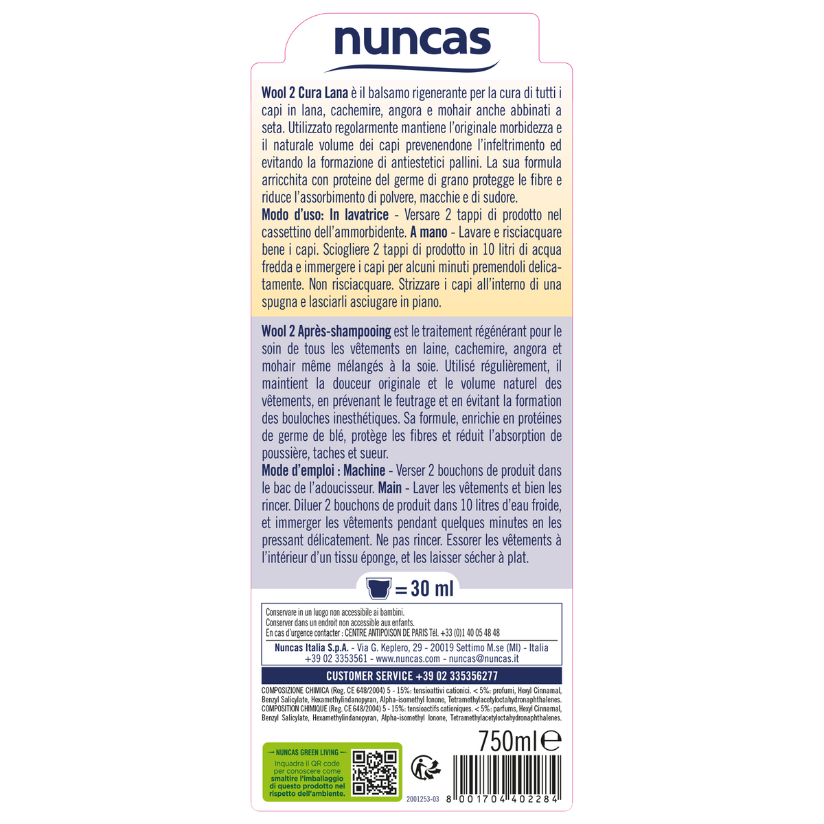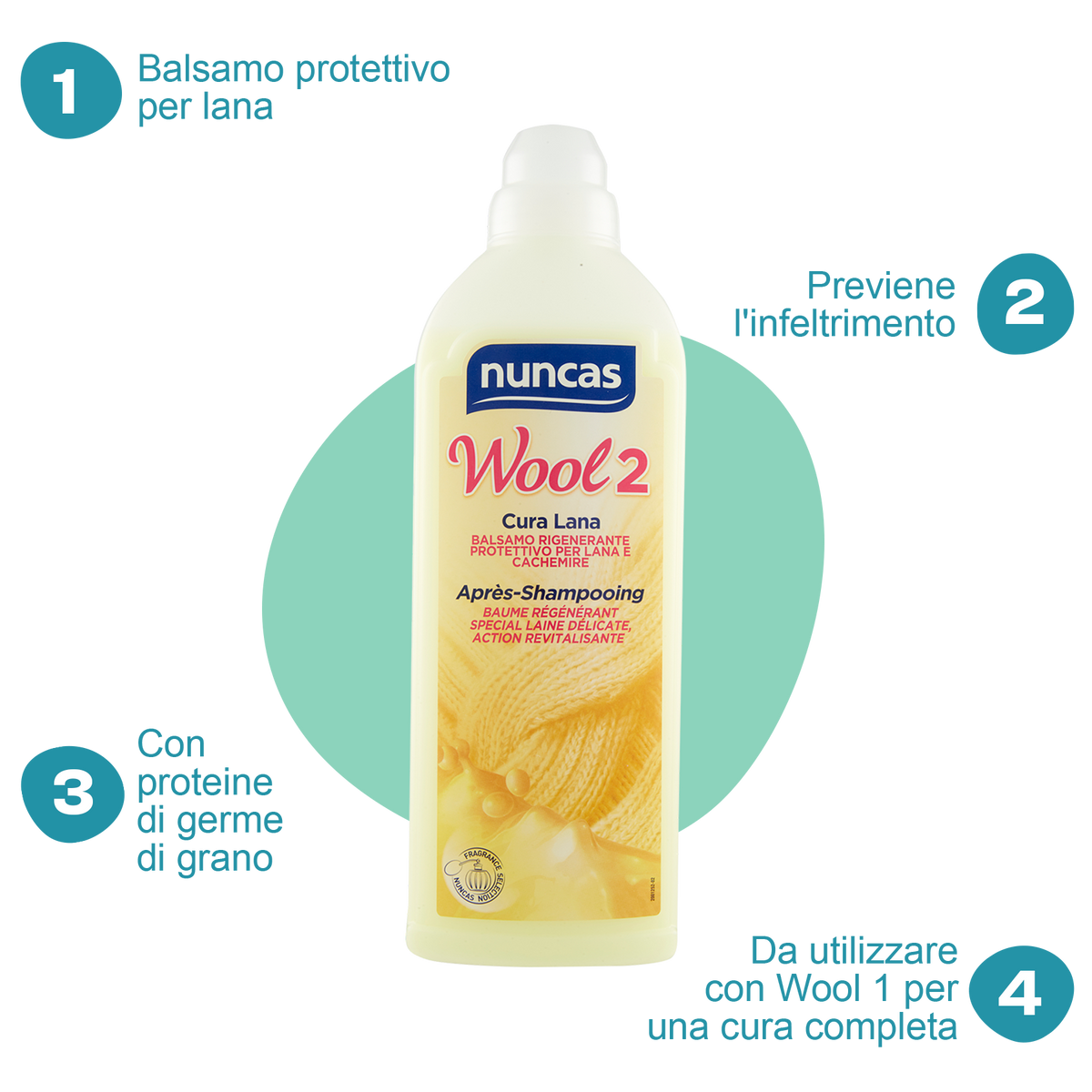 Nuncas Wool 2 balsamo rigenerante per lane pregiate, da abbinare al lavaggio a mano e in lavatrice, previene l’infeltrimento, lavaggio dopo lavaggio mantenendo inalterata nel tempo la morbidezza e i colori originali dei capi in lana. Ideale da abbinare ad ogni lavaggio con il Wool 1.